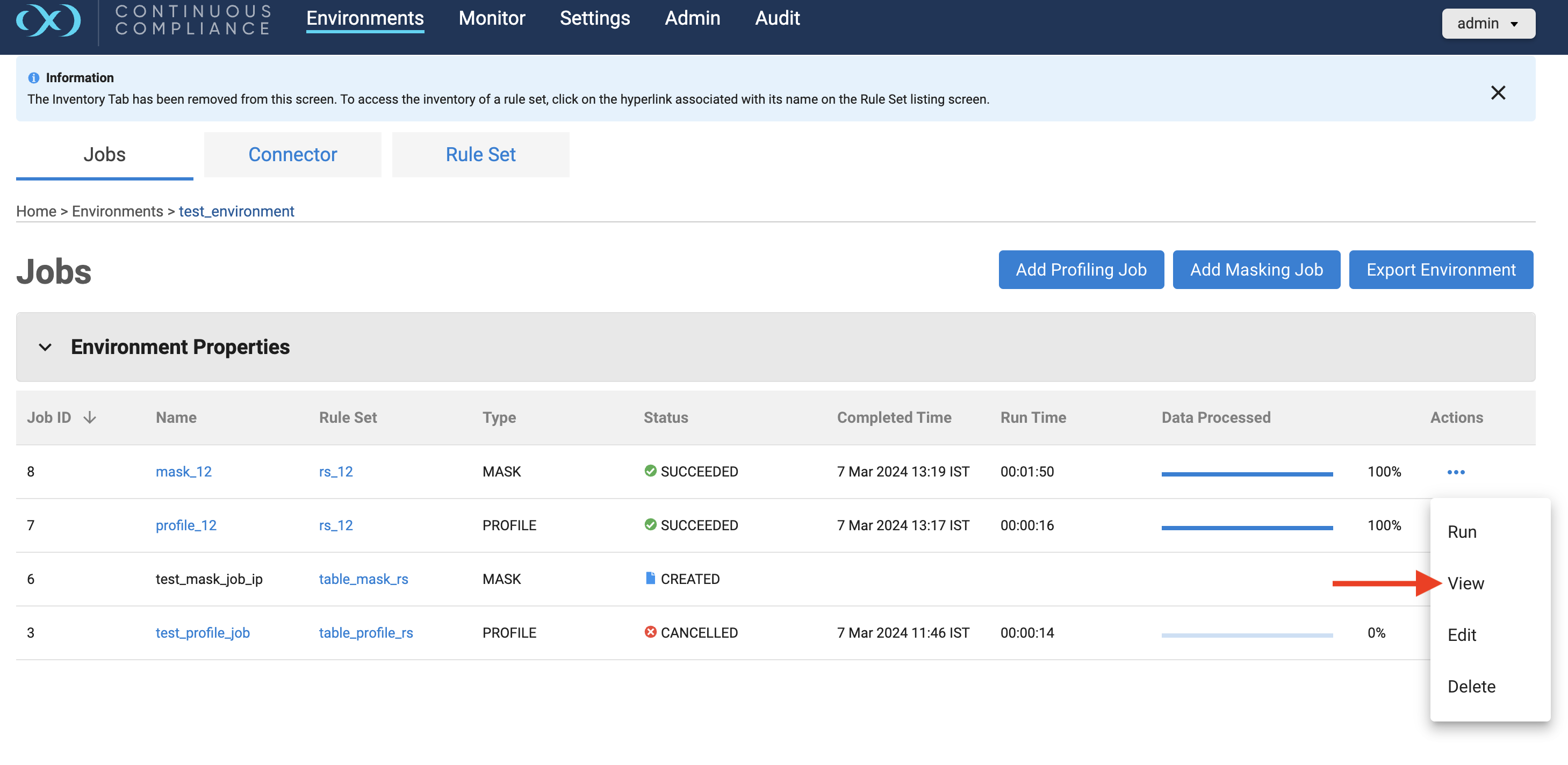 To perform a view action on any of the Masking jobs, Click the (…) button to the right of the corresponding row under the Actions column, View action will be visible.