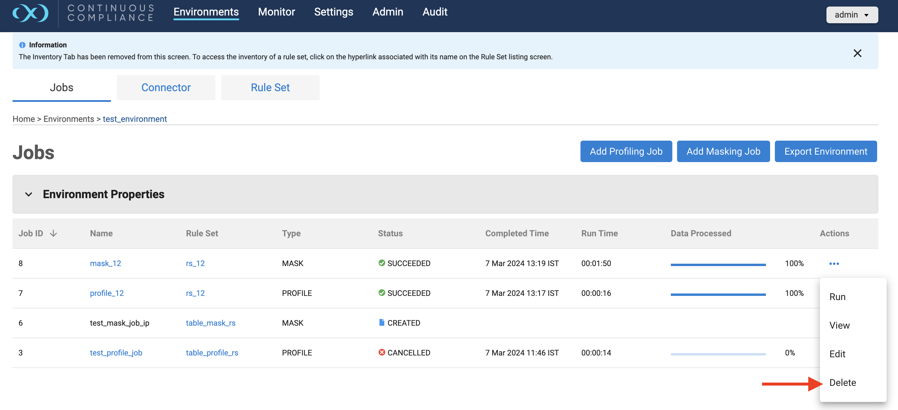 To perform a delete action on any of the Masking jobs, Click the (…) button to the right of the corresponding row under the Actions column, Delete action will be visible. If the user doesn’t have permission to delete the job, then it will be disabled.