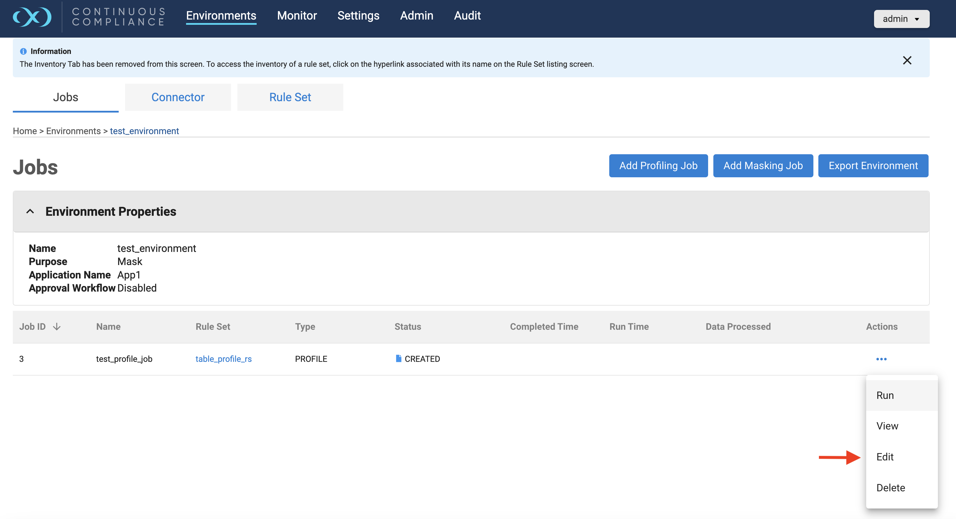 To perform an edit action on any of the Profile jobs, Click the (…) button to the right of the corresponding row under the Actions column, Edit action will be visible. If the user doesn’t have permission to edit the job, then it will be disabled.