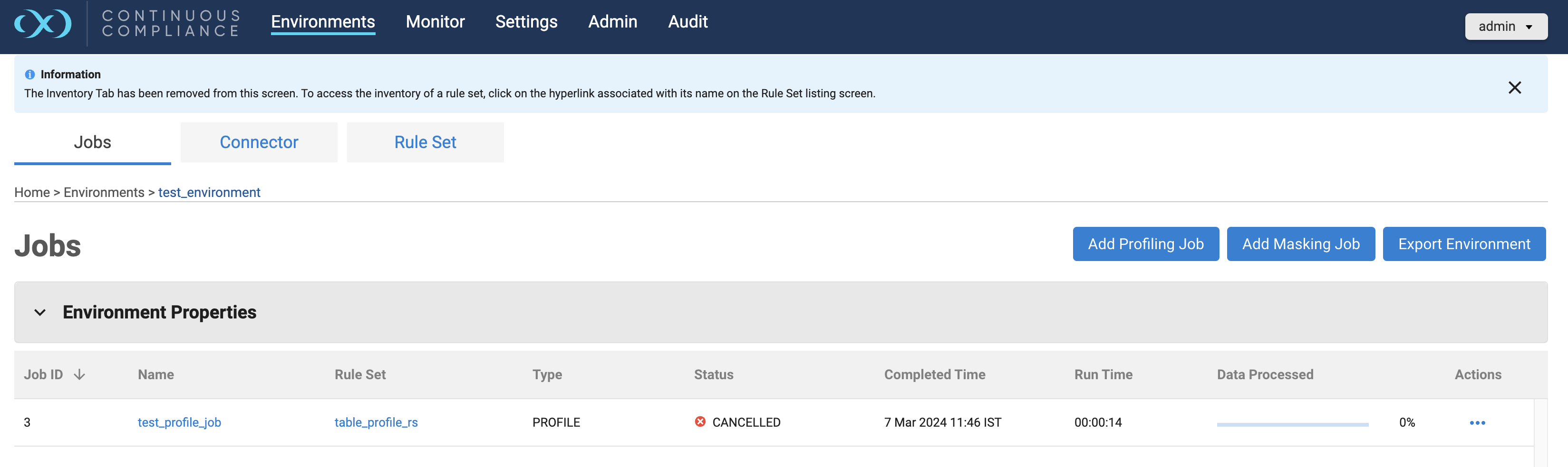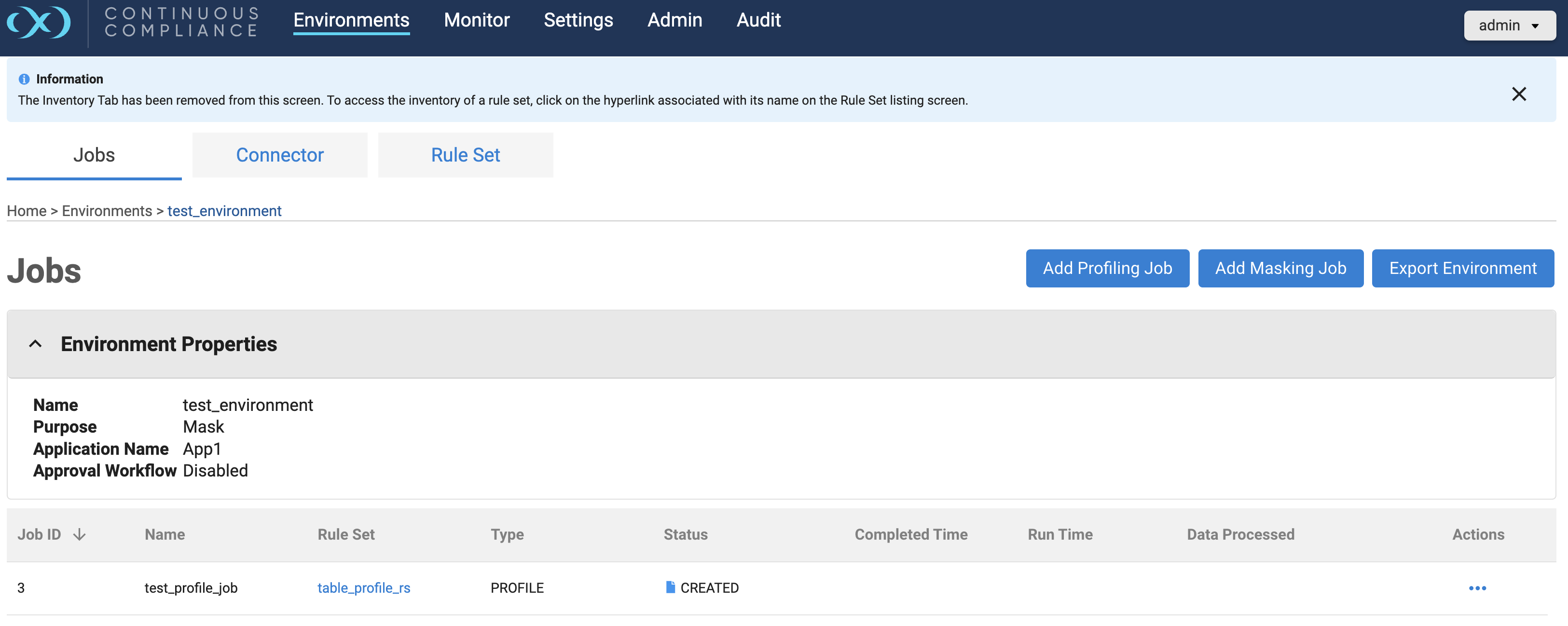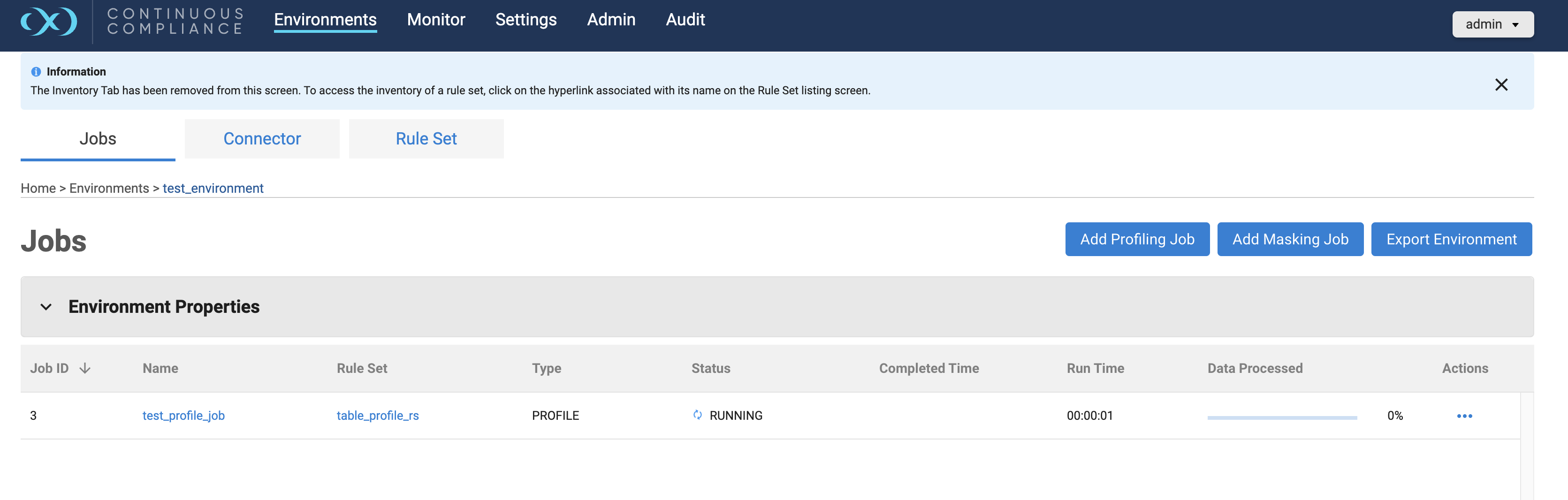 Profiling Jobs are grouped within environments on the Environment > Jobs page along with all masking jobs. To navigate to the Jobs screen, click on an environment. It will land on the Jobs page.