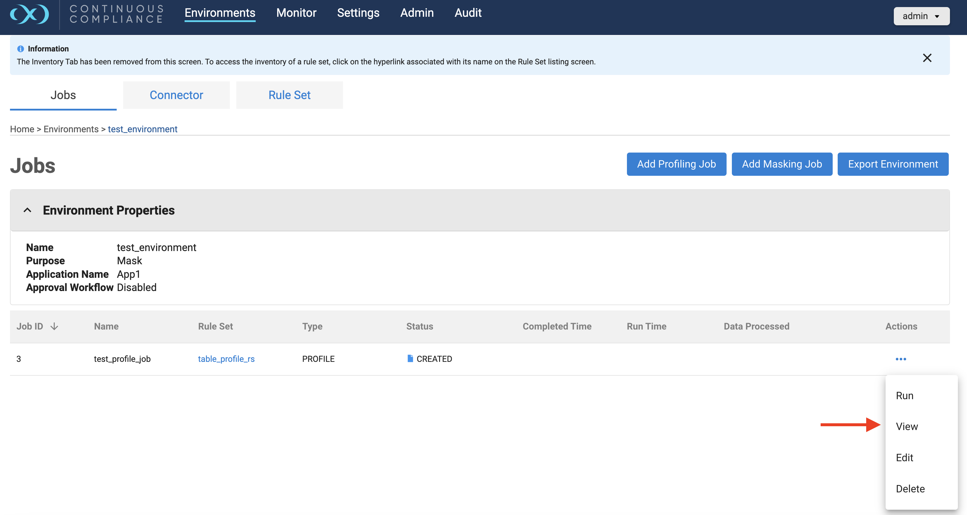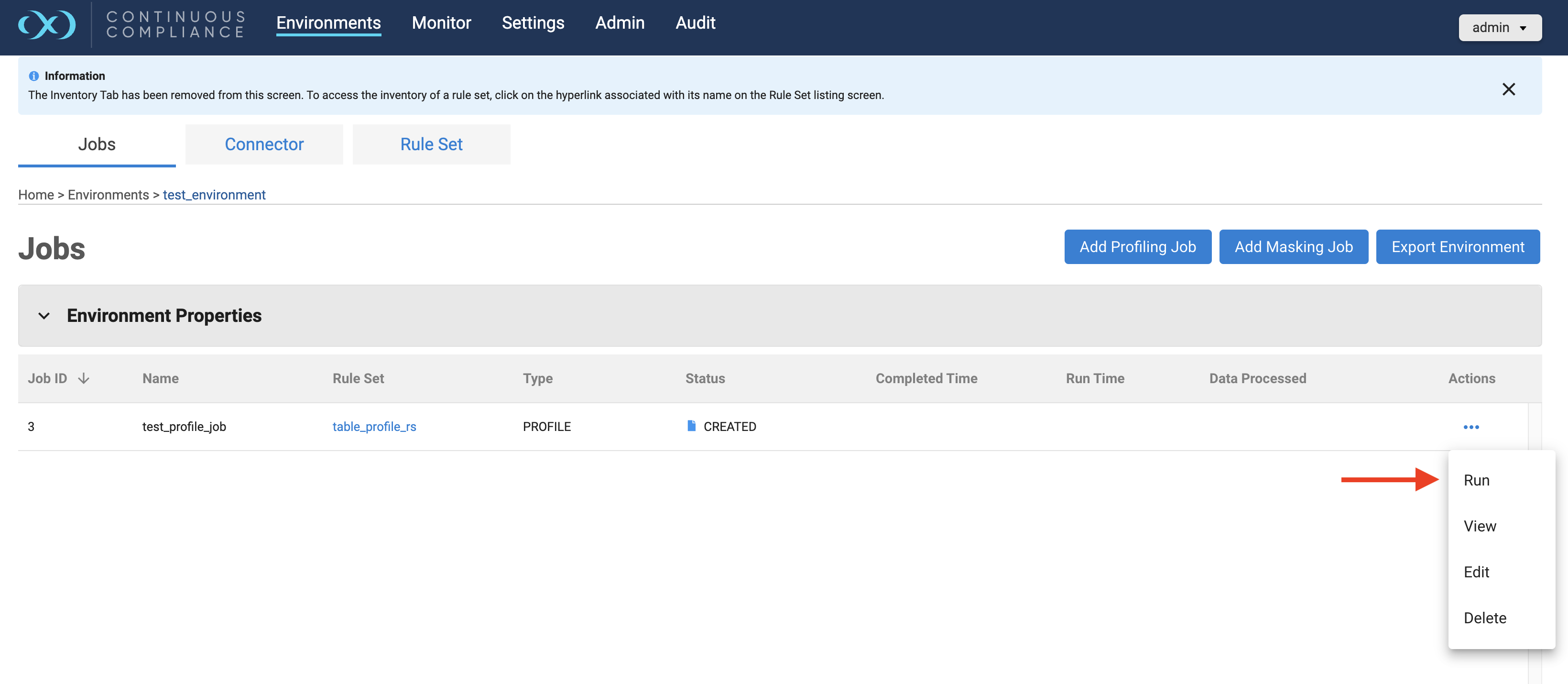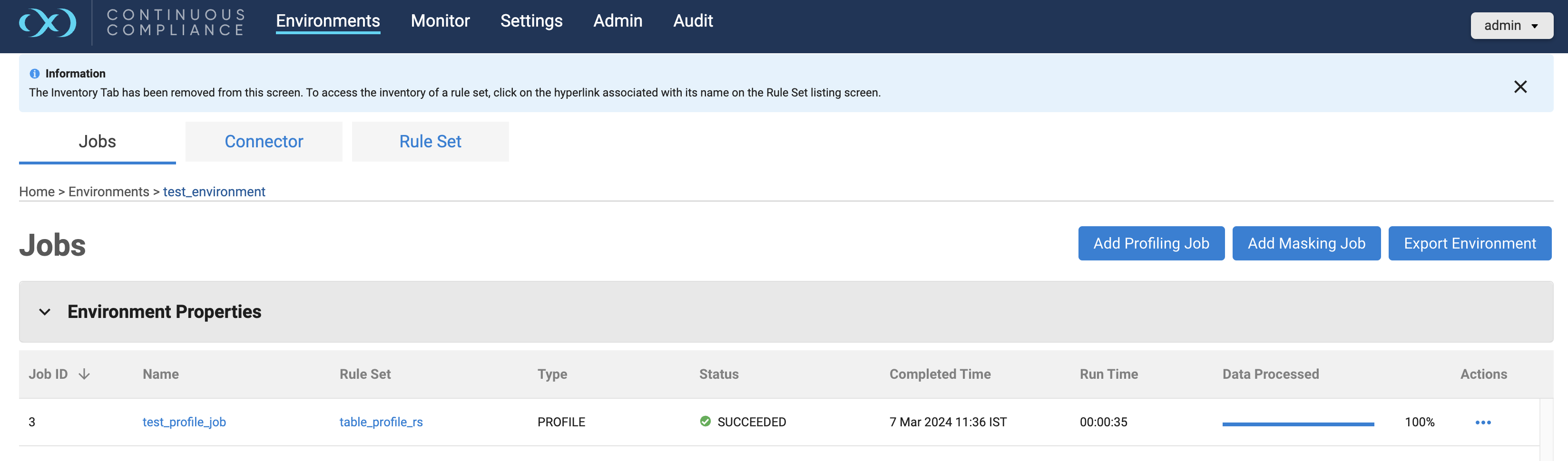 Profiling Jobs are grouped within environments on the Environment > Jobs page along with all masking jobs. To navigate to the Jobs screen, click on an environment. It will land on the Jobs page.