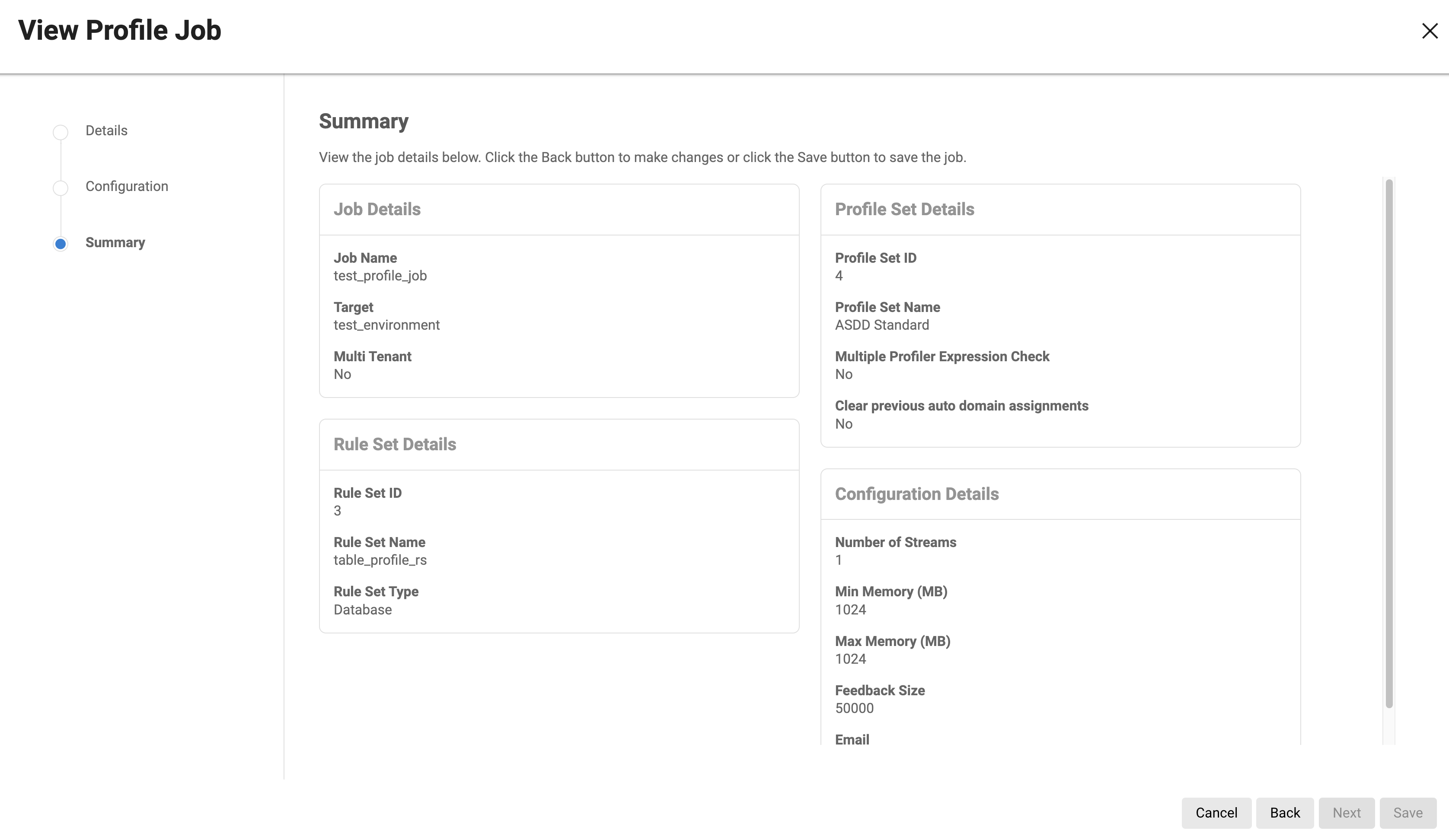 Number of Streams: The number of parallel streams to use when running the jobs. For example, you can select two streams to profile two tables in the ruleset concurrently in the job instead of one table at a time. By default, it sets DefaultStreams value from Application settings under group “profile“.