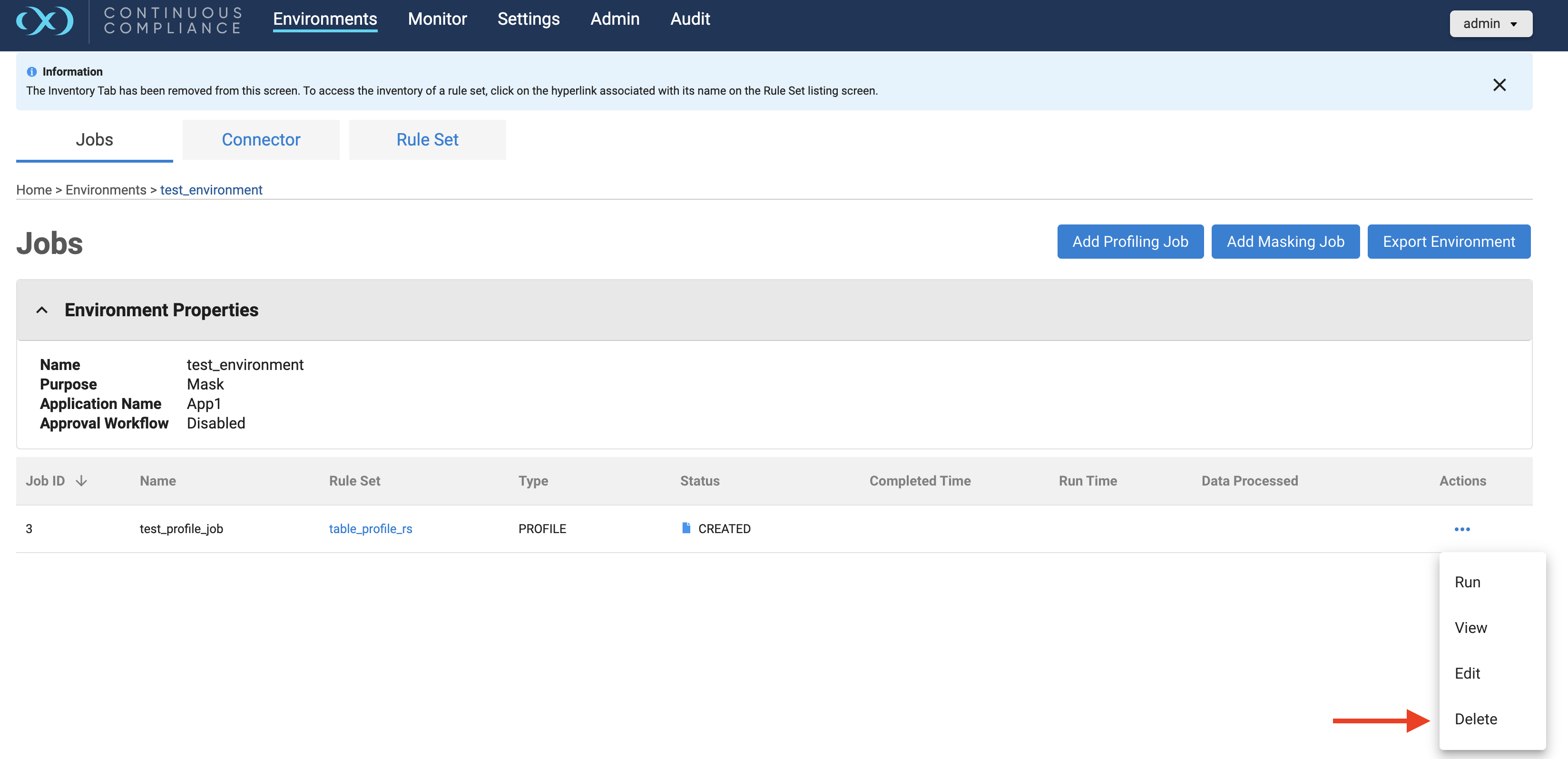 To perform a delete action on any of the Profile jobs, Click the (…) button to the right of the corresponding row under the Actions column, Delete action will be visible. If the user doesn’t have permission to delete the job, then it will be disabled.
