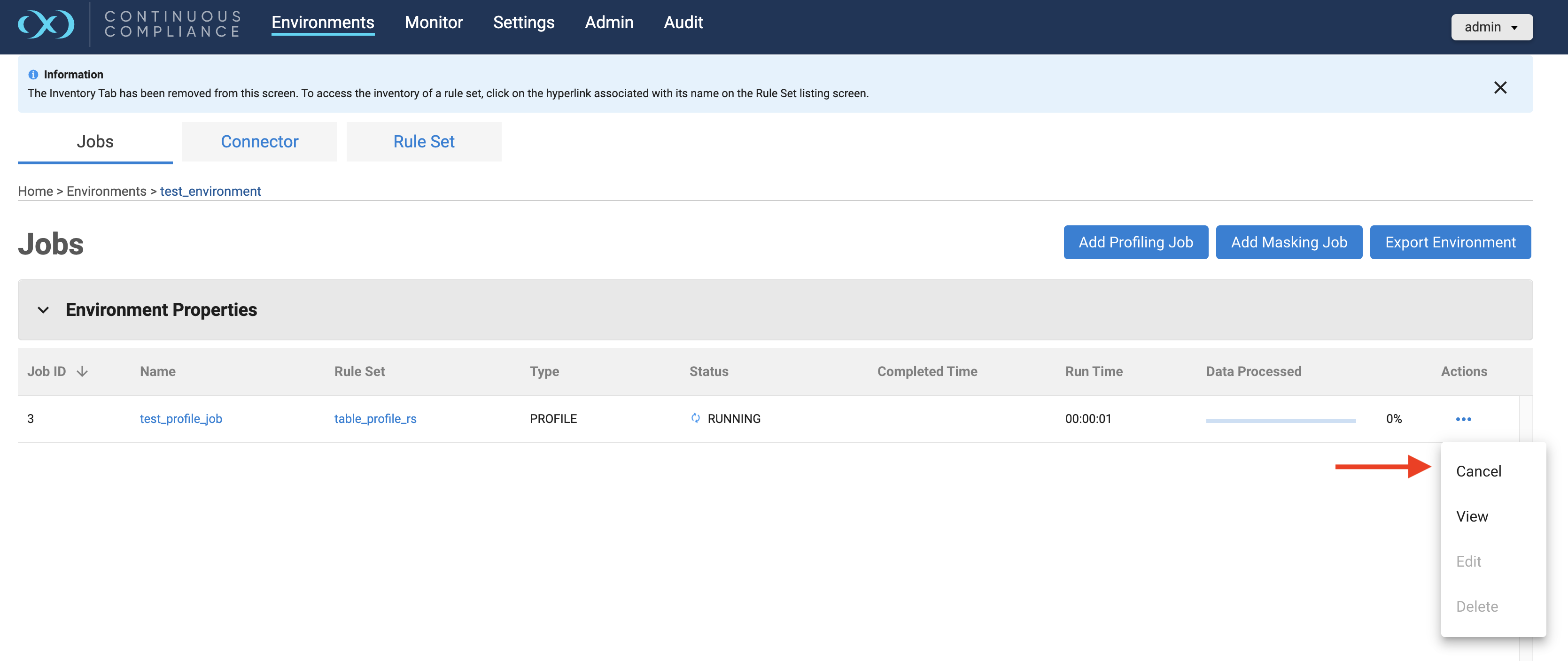 To cancel running Profile Job, Click the (…) button to the right of the corresponding row under the Actions column, Cancel action will be visible. It will be visible only in case the job is running. If the user doesn’t have permission to run the job, then it will be disabled.