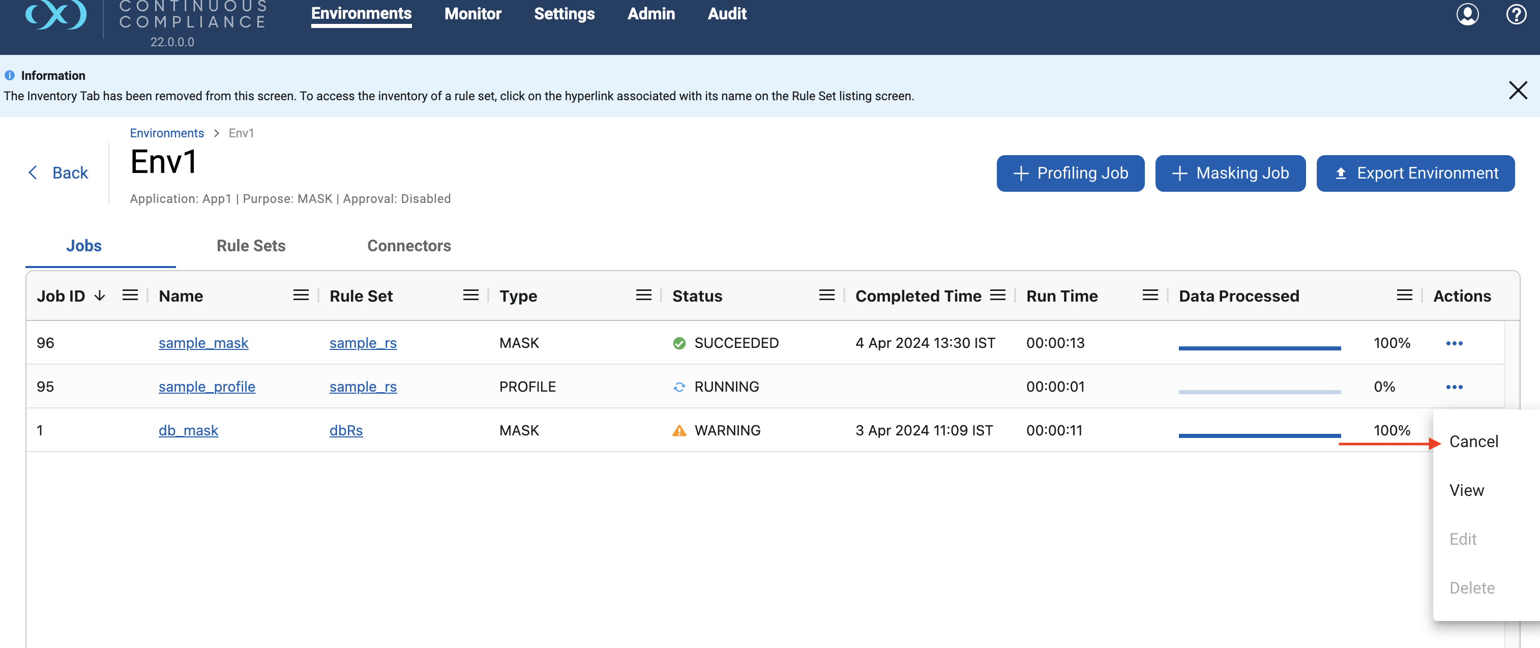 On clicking Cancel Action, it will prompt for confirmation. Click on Confirm to cancel the job.