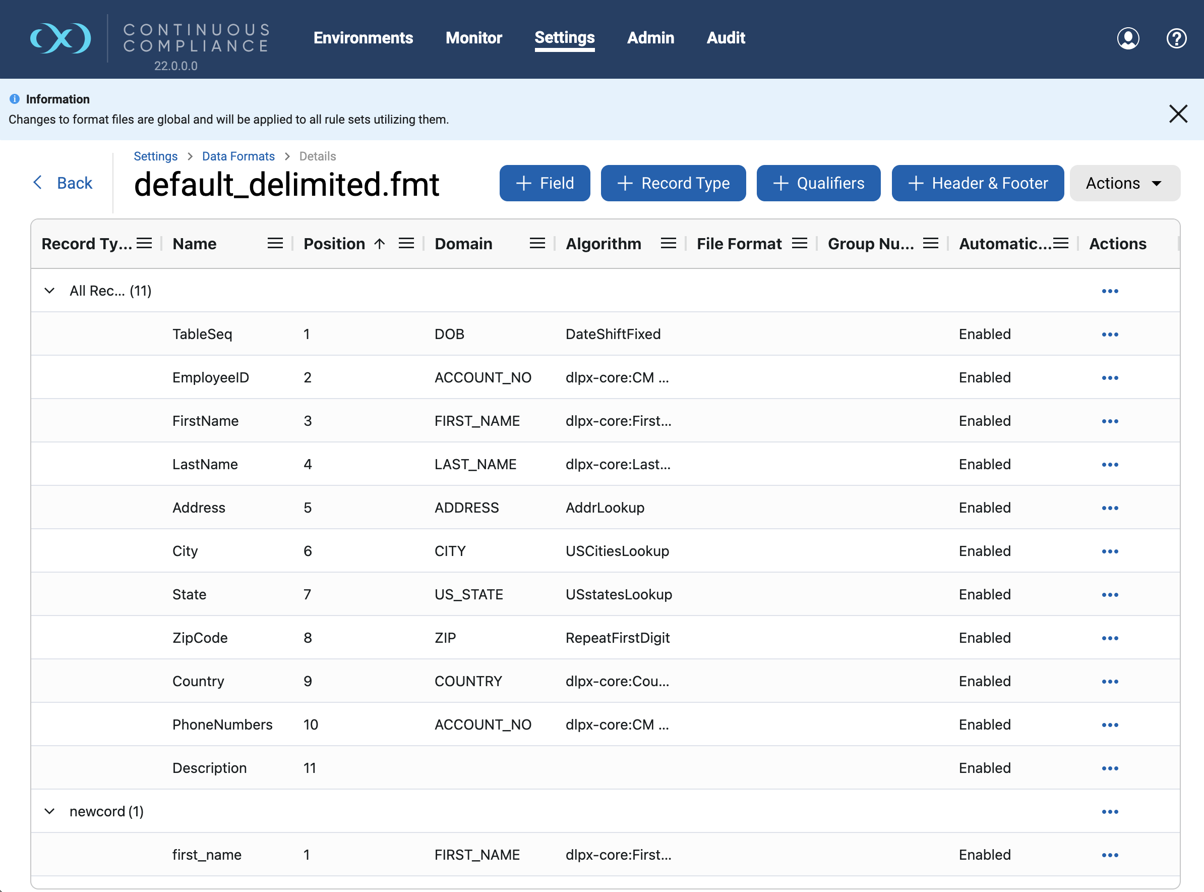 Navigate to Settings → Data Format, click the hyperlink of a format Name from the corresponding column. From there, an inventory-like screen will be available with several listed fields.
