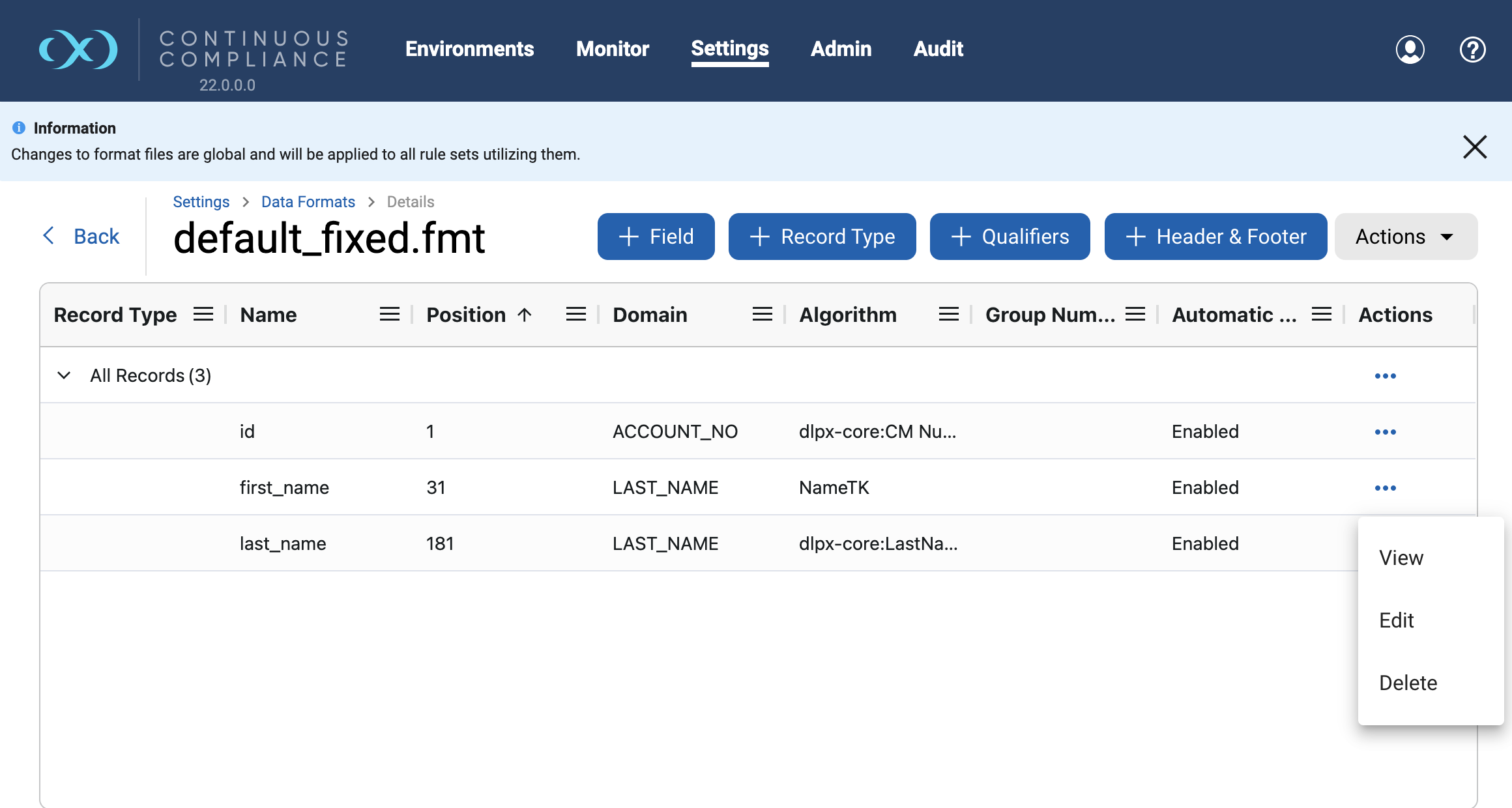 You can also navigate to the Data Format page from any Rulesets Inventory screen by clicking on the Edit File Format button. An information banner is added on the Environments Inventory page to help user with navigation.