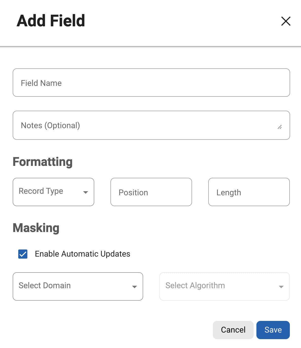 A field’s masking settings ( automatic updates setting, domain assignment, and algorithm assignment) can also be edited from the Inventory screen.