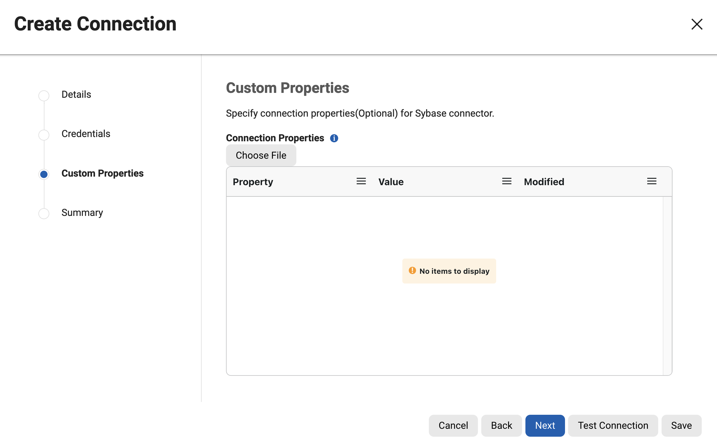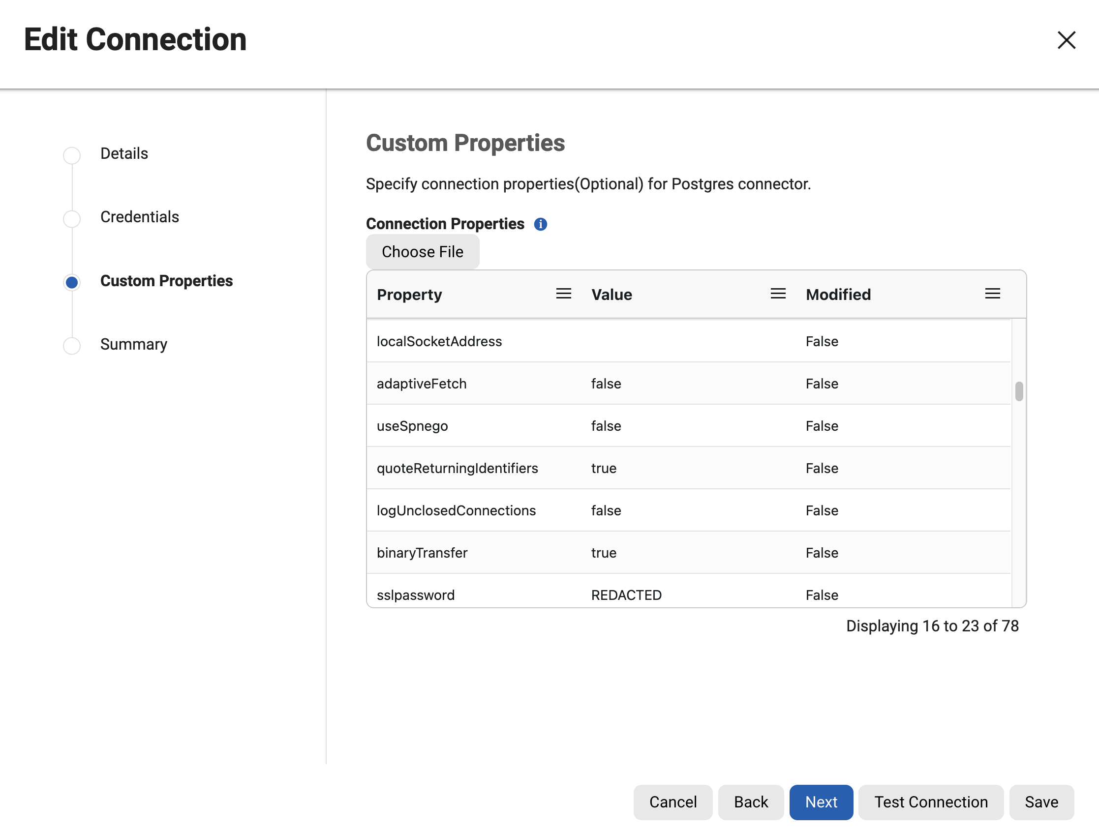 To change connection properties or upload a new one, select Choose File and upload the properties file in the Custom Properties Step.