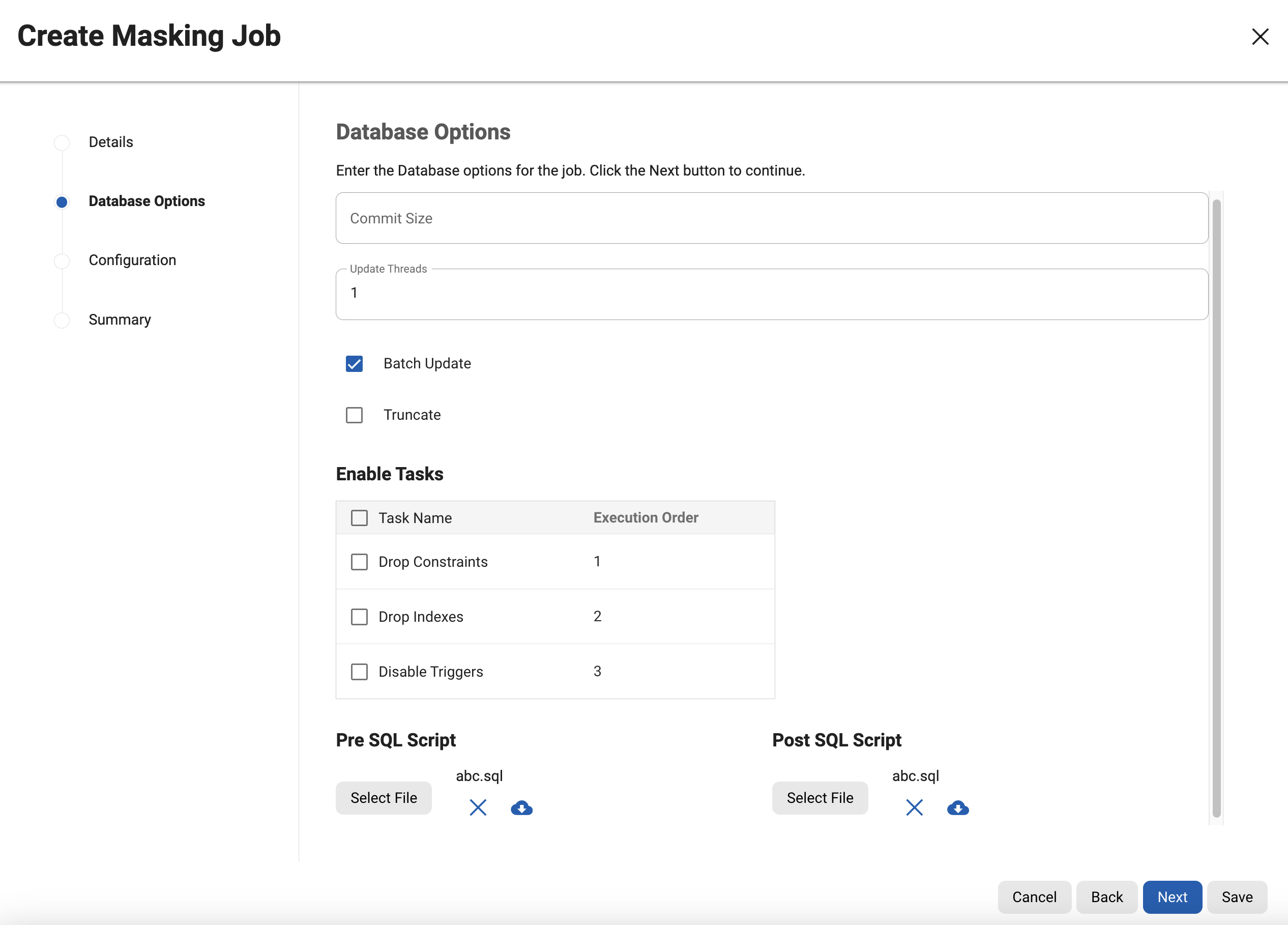 Enable Tasks (optional): It displays tasks implemented by the driver support plugin being used. The default is for each checkbox to not be selected and therefore not perform any of the tasks. If the masking job being created is for a built-in connector with a built-in driver support plugin, the options displayed will be Disable Constraints, Disable Triggers, and Drop Indexes. For a full list of supported built-in connectors and information on specific built-in driver support plugins, see Built-in Driver Supports.
