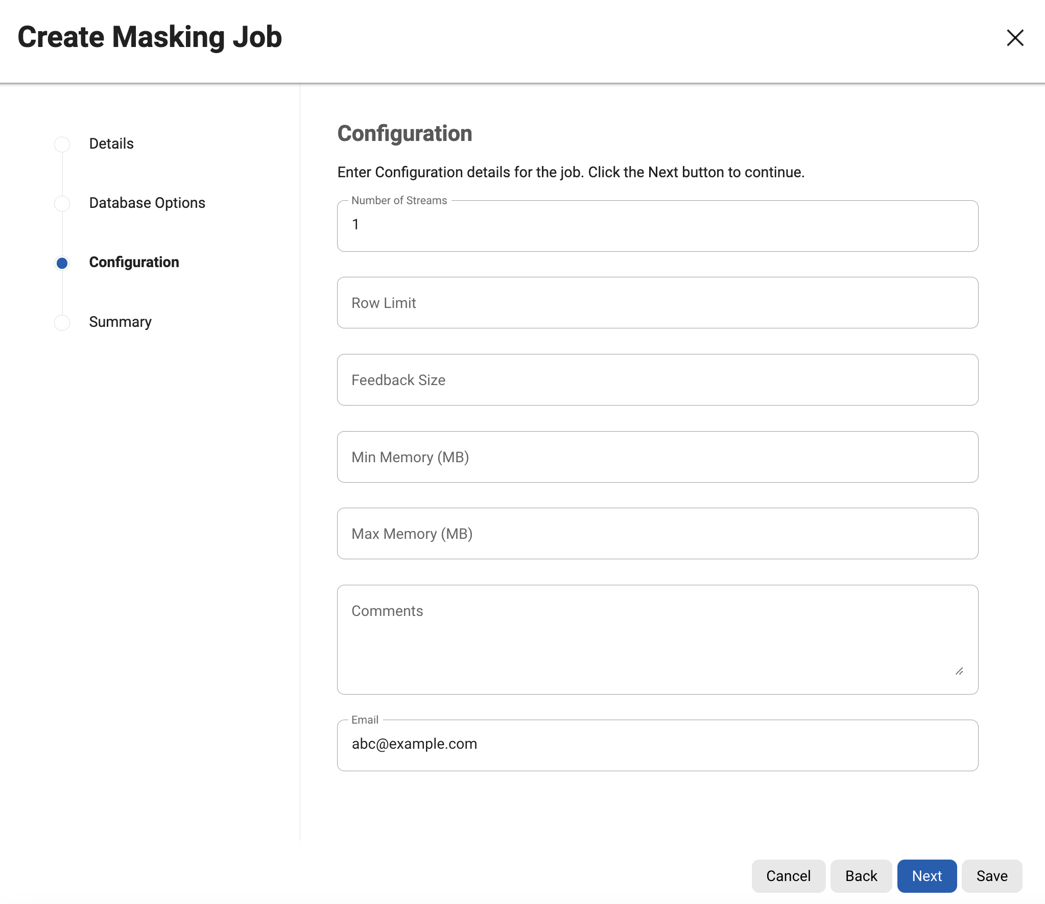 Number of Streams: The number of parallel streams to use when running the job. For example, you can select two streams to mask two tables in the Rule Set concurrently in the job instead of one table at a time.
