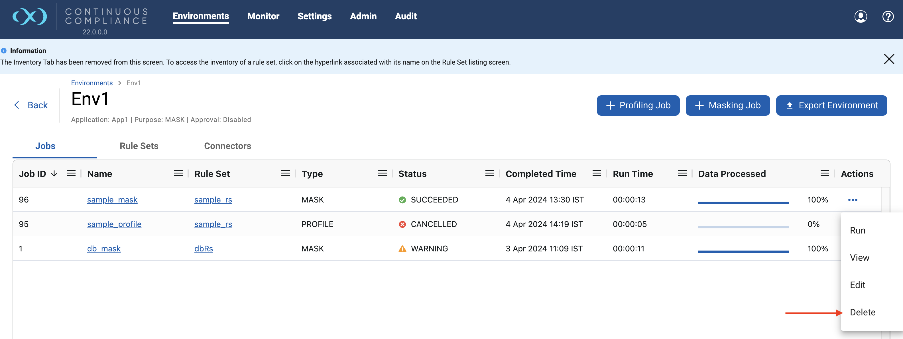 On clicking Delete Action, it will prompt for confirmation. Click on Confirm to delete the job.