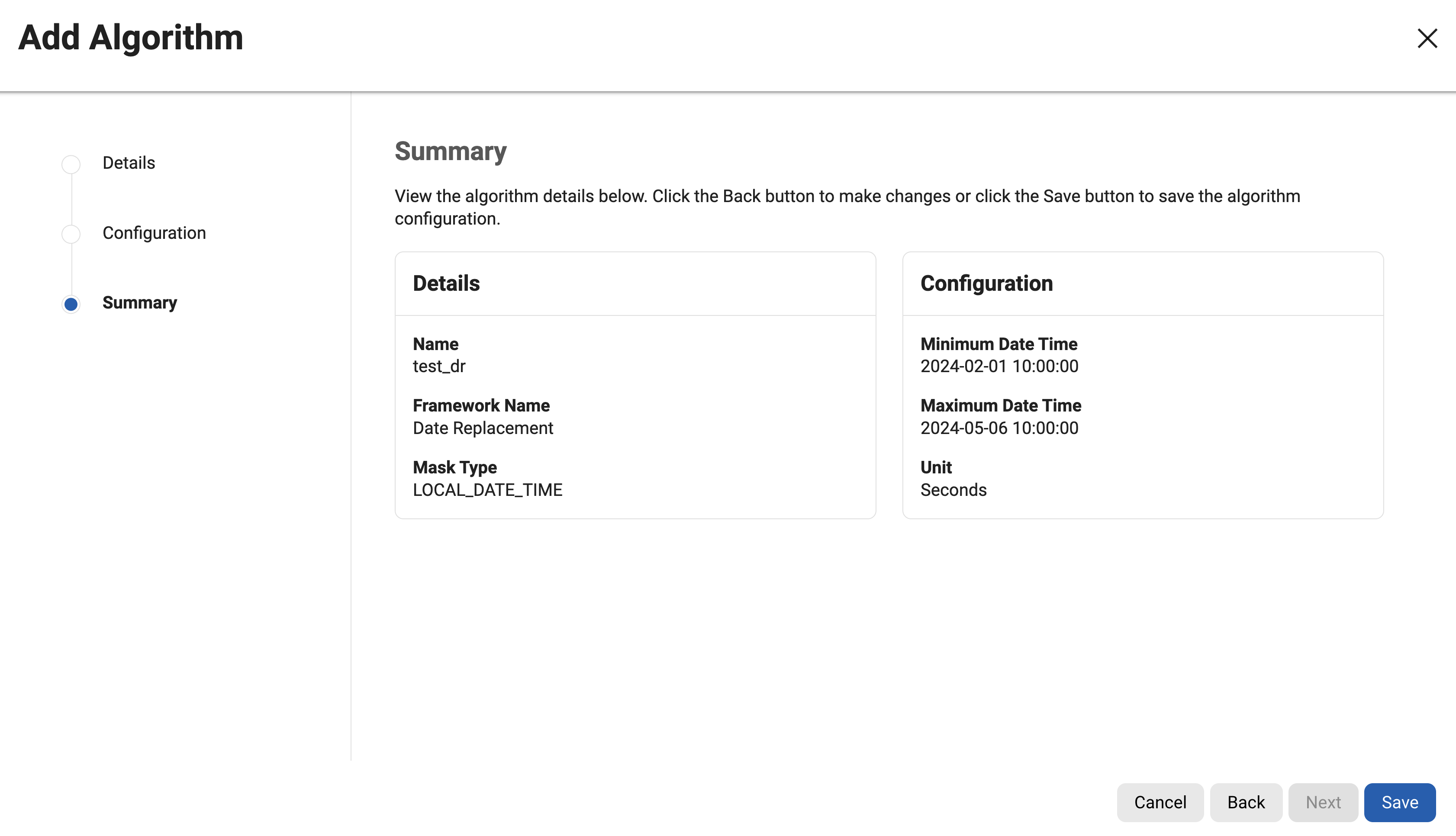 Enter Min Date and Max Date. These define the range from which the algorithm will select output values. The range is inclusive of both values. All units of time less than the specified unit must be set to 0. For example, a configuration with the unit set to Days must have the time portion set to 00:00:00.