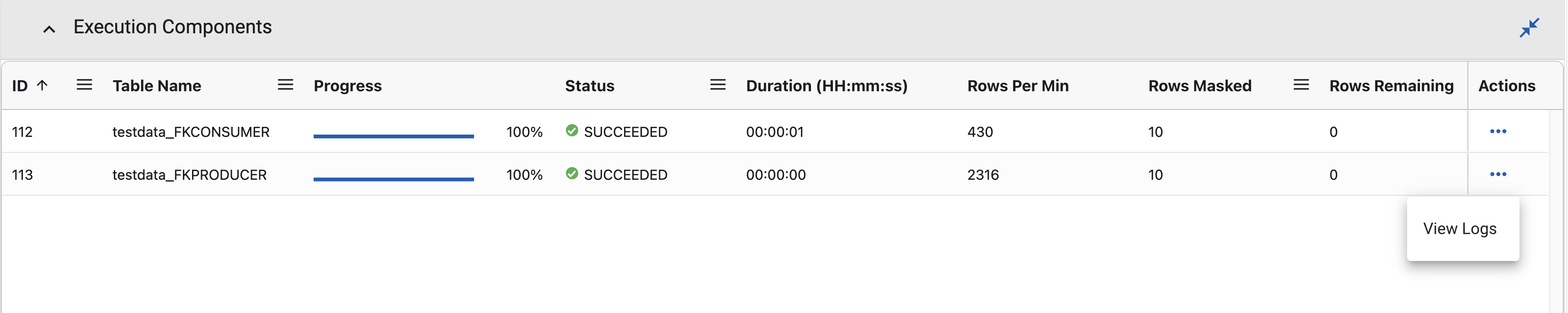 The execution components grid supports sorting and filtering on ID, Table Name, Status and Rows Masked columns.