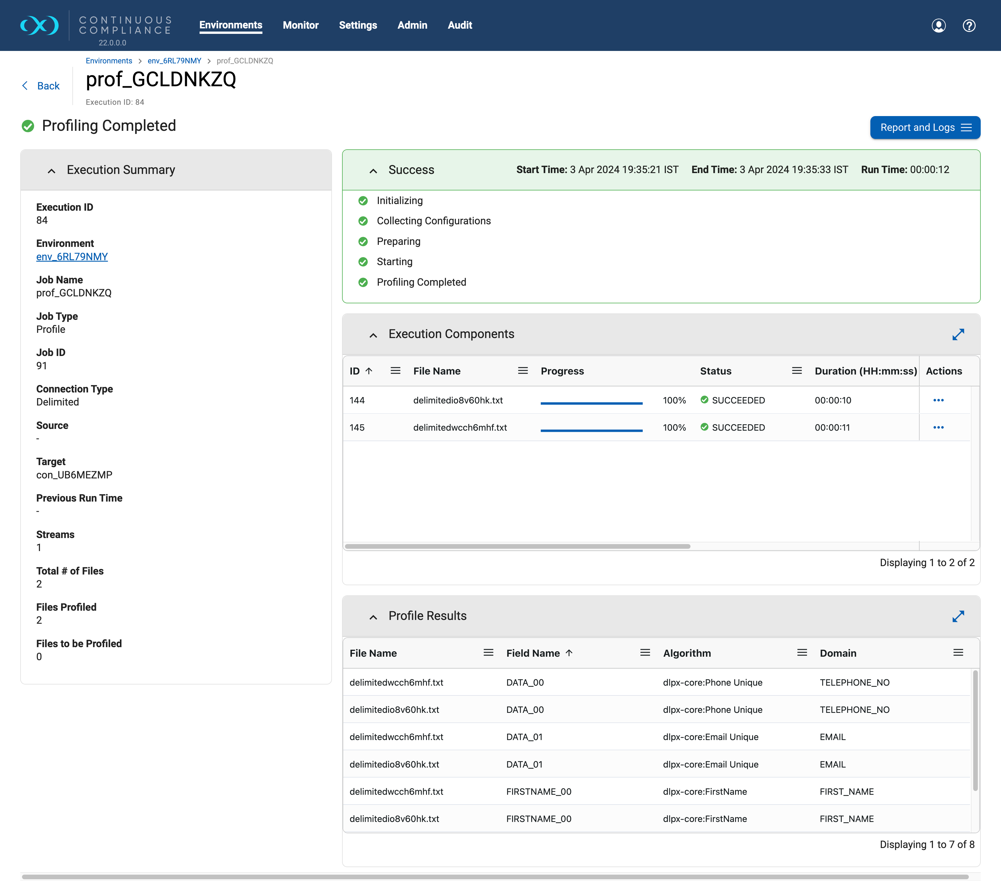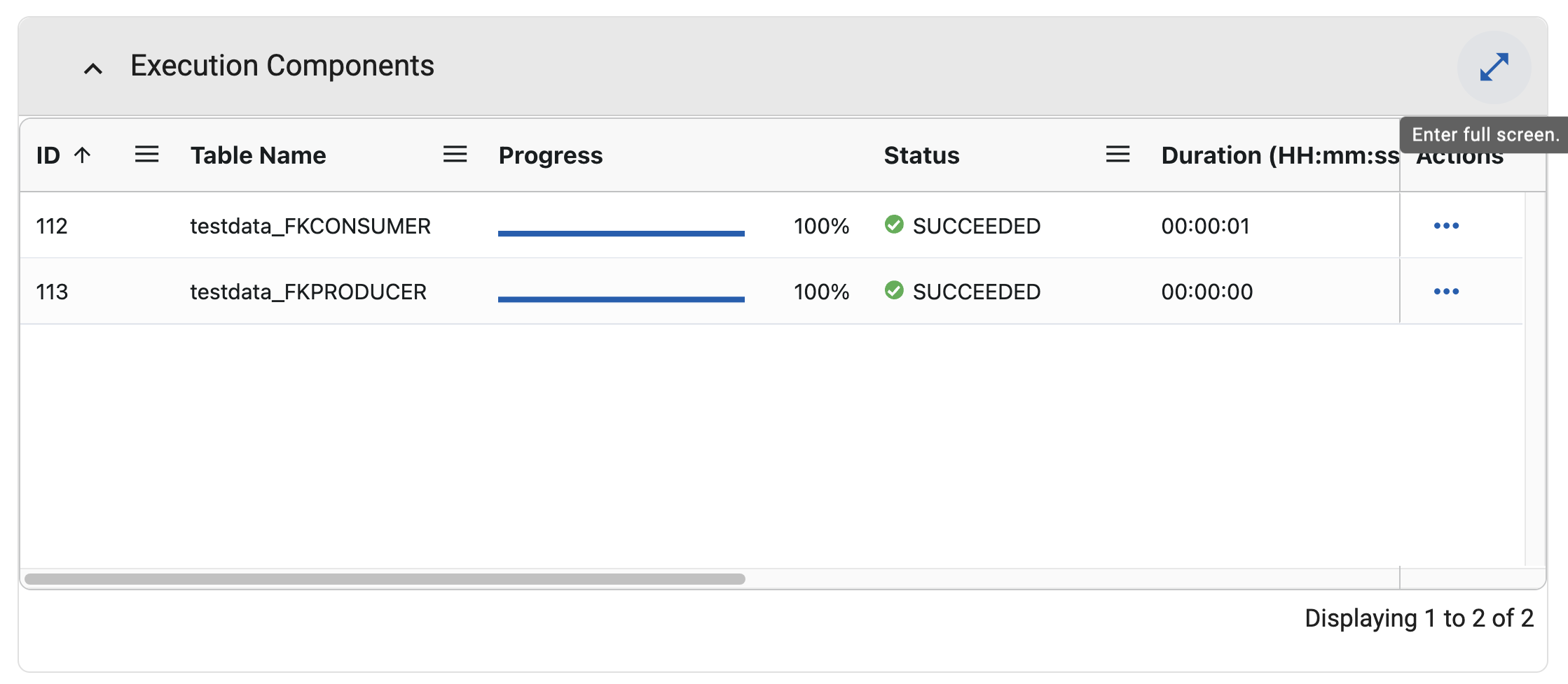 In addition to seeing this information about each job, you can look into the status/progress of each table/file defined in the job. Each table/file will be displayed under Execution Components. It includes information such as Time taken for processing, Rows Masked per Minute, Rows Masked, Rows Remaining, Number of columns/fields having Non-conformant data, etc.