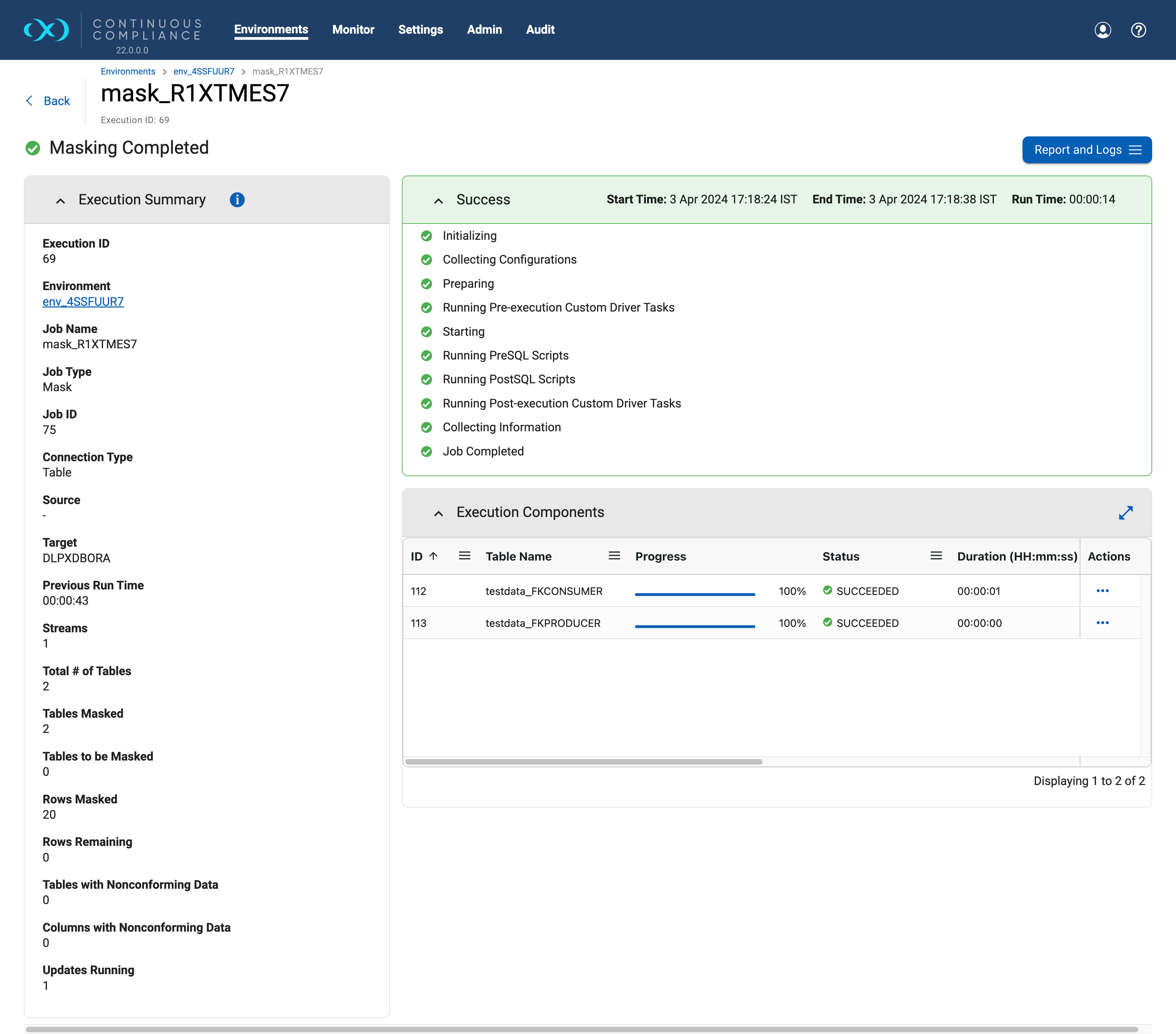 This section displays more granular information about execution including; Environment name, Connector name, Job Name, Previous run time, Number of tables/files in the job, Number of tables/files masked, Number of tables/files to be masked, Type of job, Rows remaining to mask, Rows masked, Number of streams, etc.
