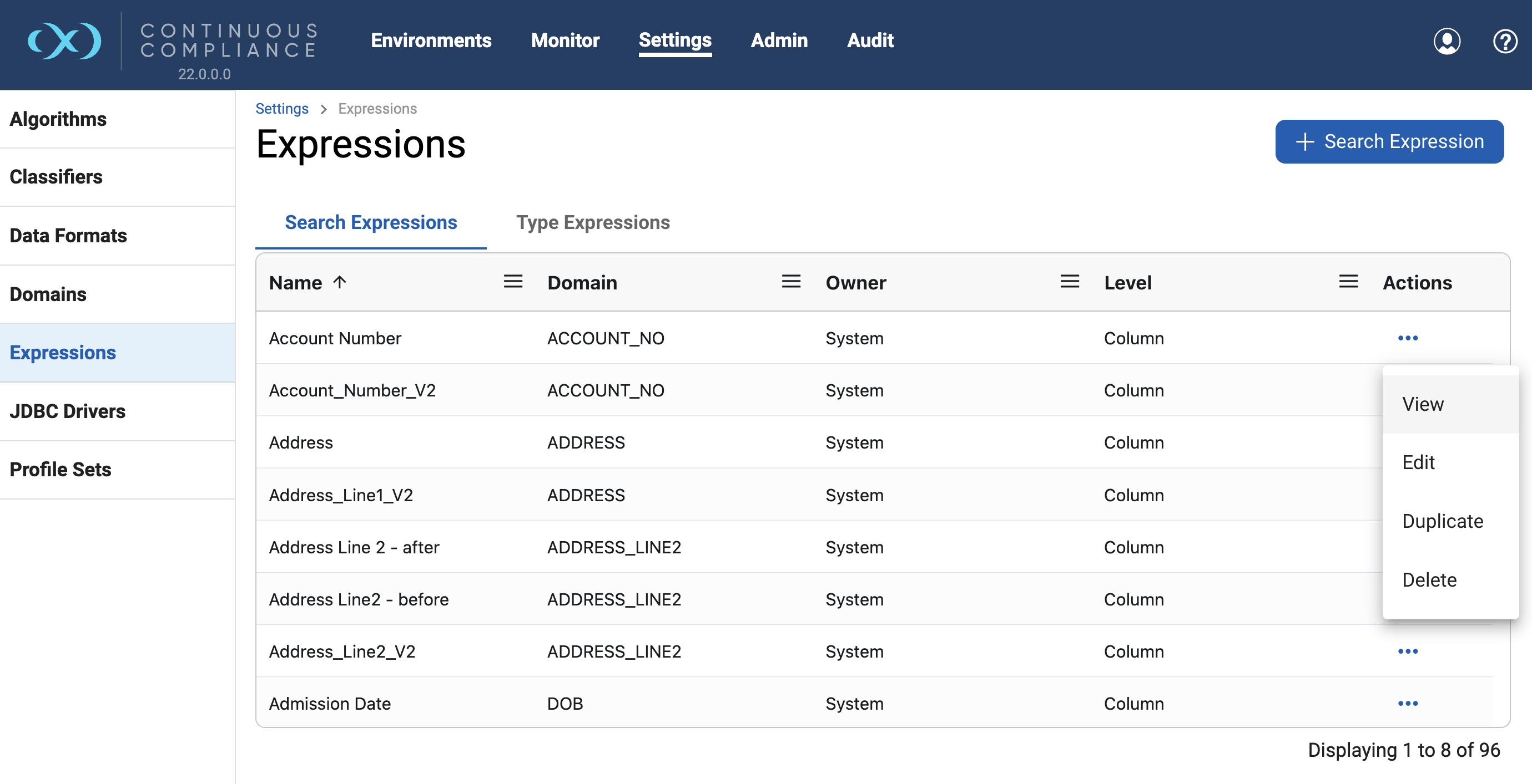 To view a list of all search expressions, Navigate to Settings > Expressions. By default, the Search Expressions tab is selected and all the search expressions will be displayed.