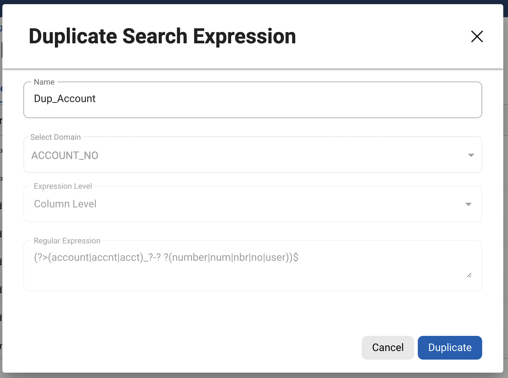 On selecting a duplicate option, details will be pre-filled to the new search expression dialog, and the user can give a new name and duplicate the search expression.