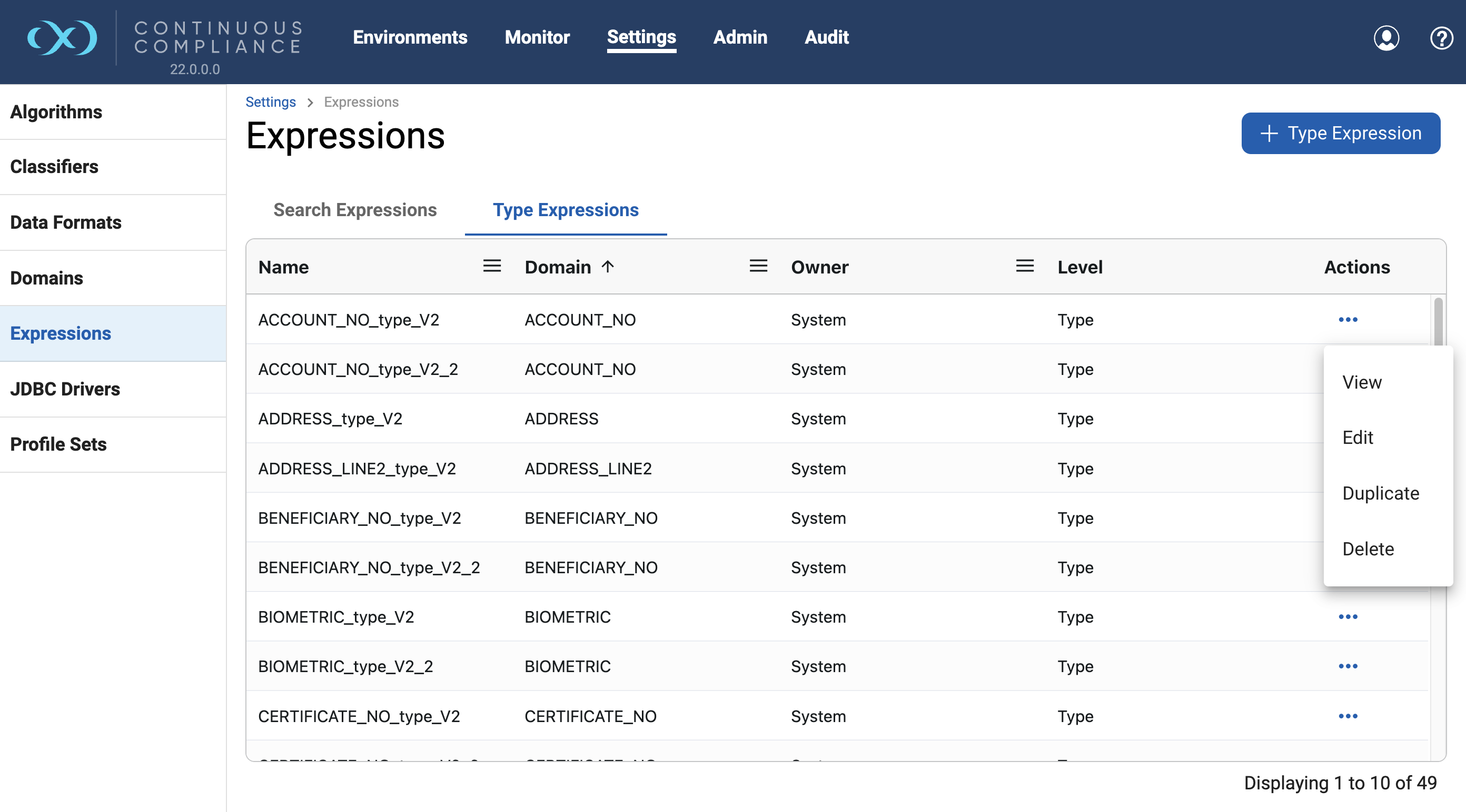 To view a list of all type expressions, Navigate to Settings > Expressions and select the Type Expressions tab.