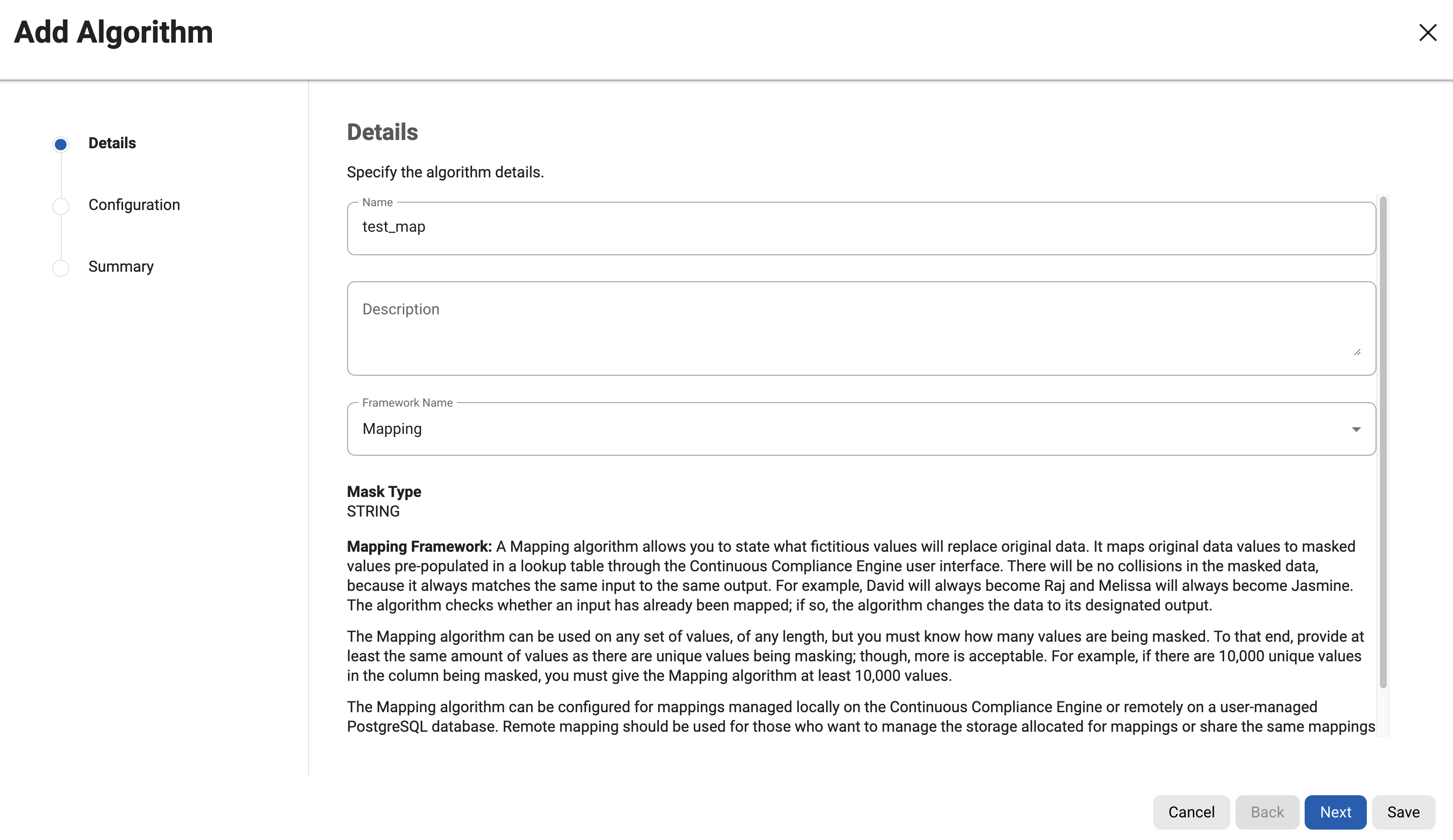 A Mapping algorithm allows you to state what fictitious values will replace the original data. It maps original data values to masked values pre-populated in a lookup table through the Continuous Compliance Engine user interface. There will be no collisions in the masked data because it always matches the same input to the same output. For example, David will always become Raj and Melissa will always become Jasmine. The algorithm checks whether an input has already been mapped; if so, the algorithm changes the data to its designated output.