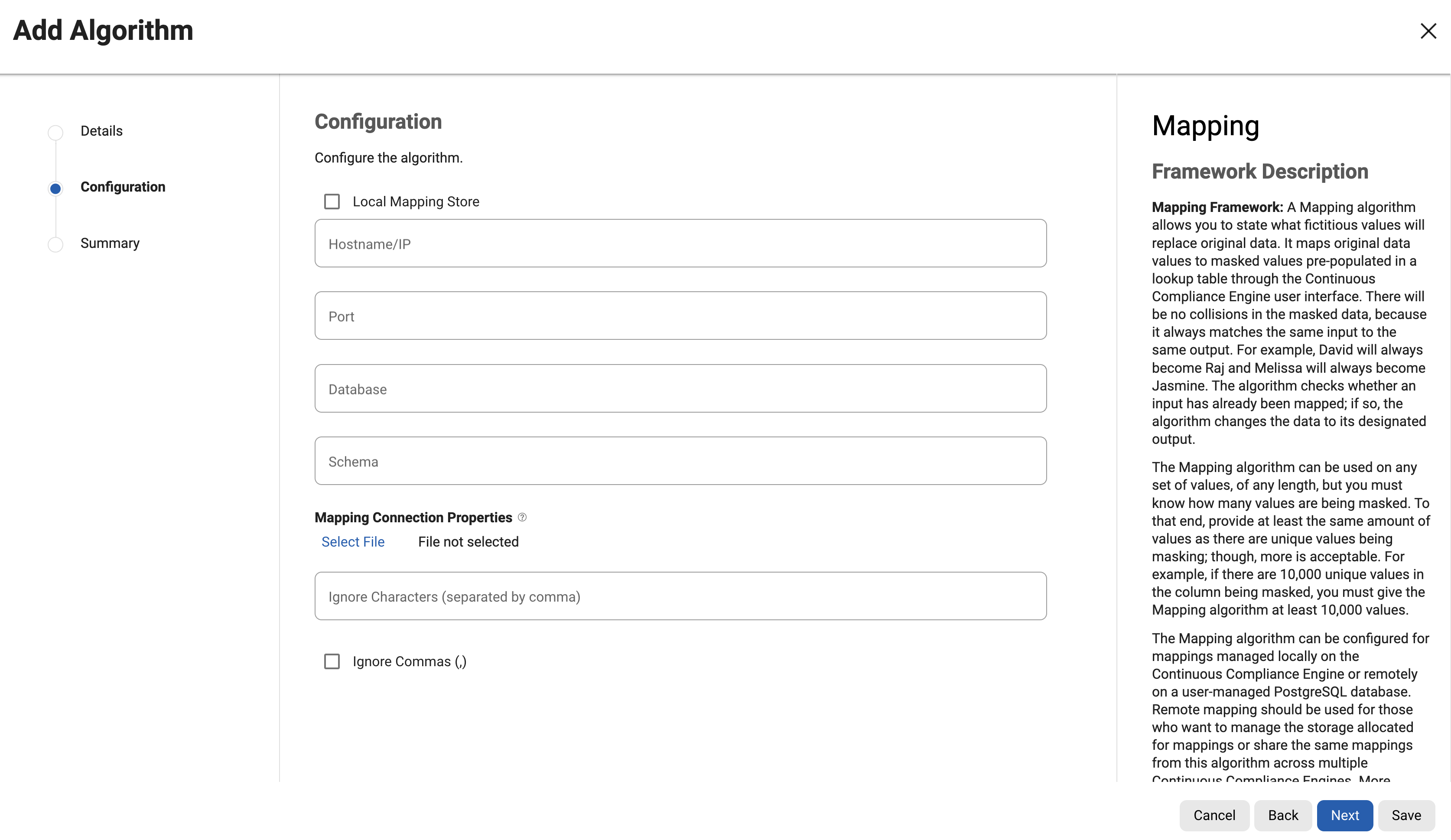 The Mapping algorithm can be configured for mappings managed locally on the Continuous Compliance Engine or remotely on a user-managed PostgreSQL database. Remote mapping should be used for those who want to manage the storage allocated for mappings or share the same mappings from this algorithm across multiple Continuous Compliance Engines. More information about remote mapping can be found in the Remote mapping page.