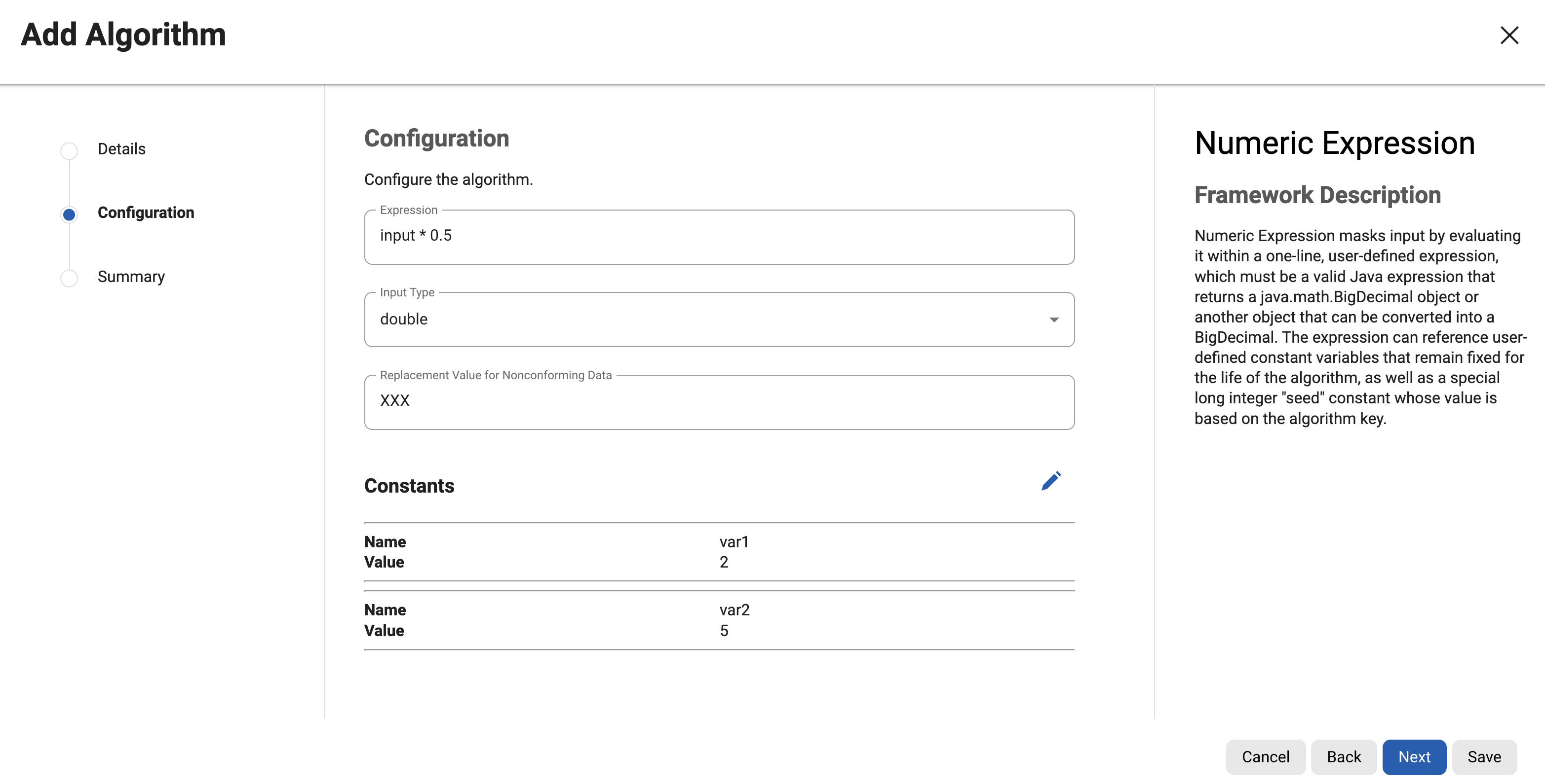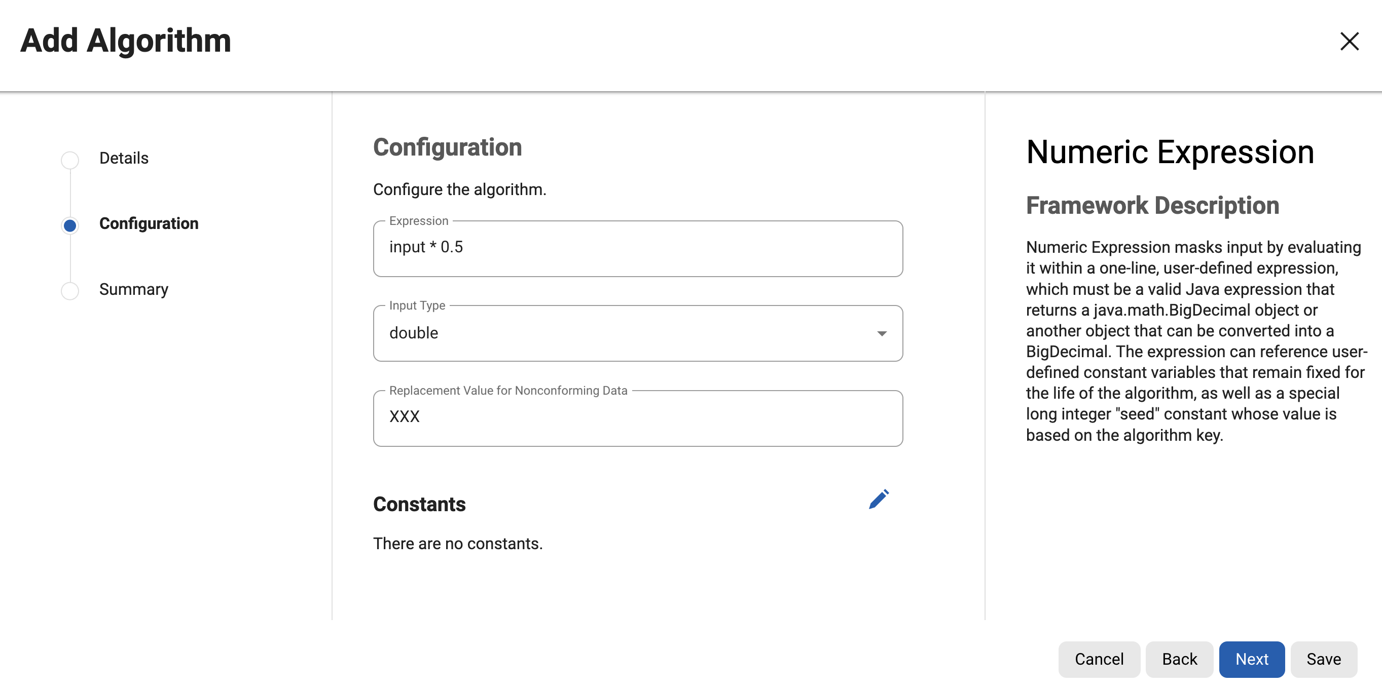 Numeric Expression algorithms mask numeric input by evaluating it within a one-line, mathematical expression written by the user in the Java programming language. The expression can reference the current unmasked value via an implicit variable called input.