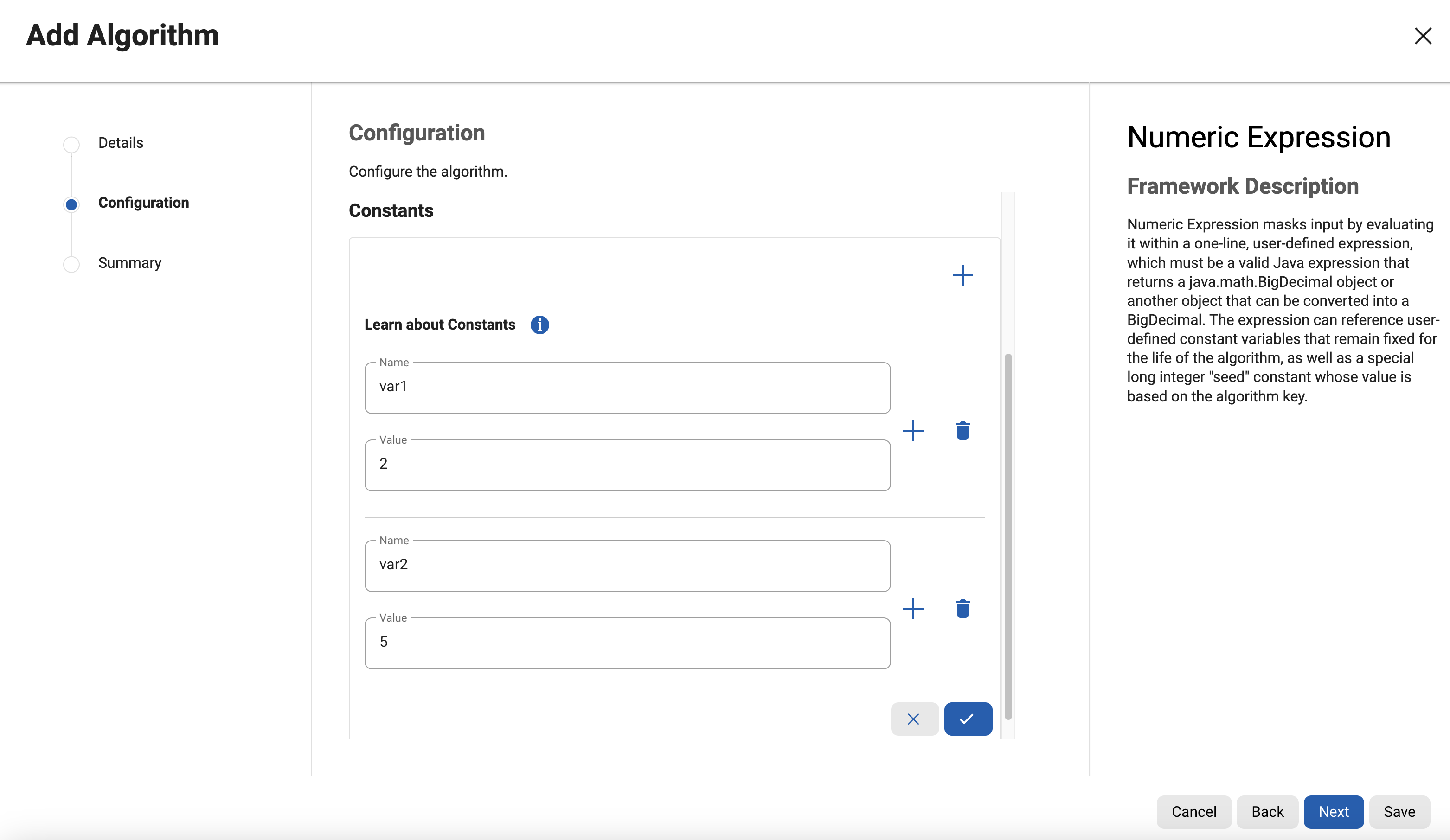 Constants are variables that the expression can reference by name and whose values remain fixed for the life of a masking job. Constant names must be valid Java variable names. No two constants can have the same name, nor can "input" or "seed" be used as a constant name.