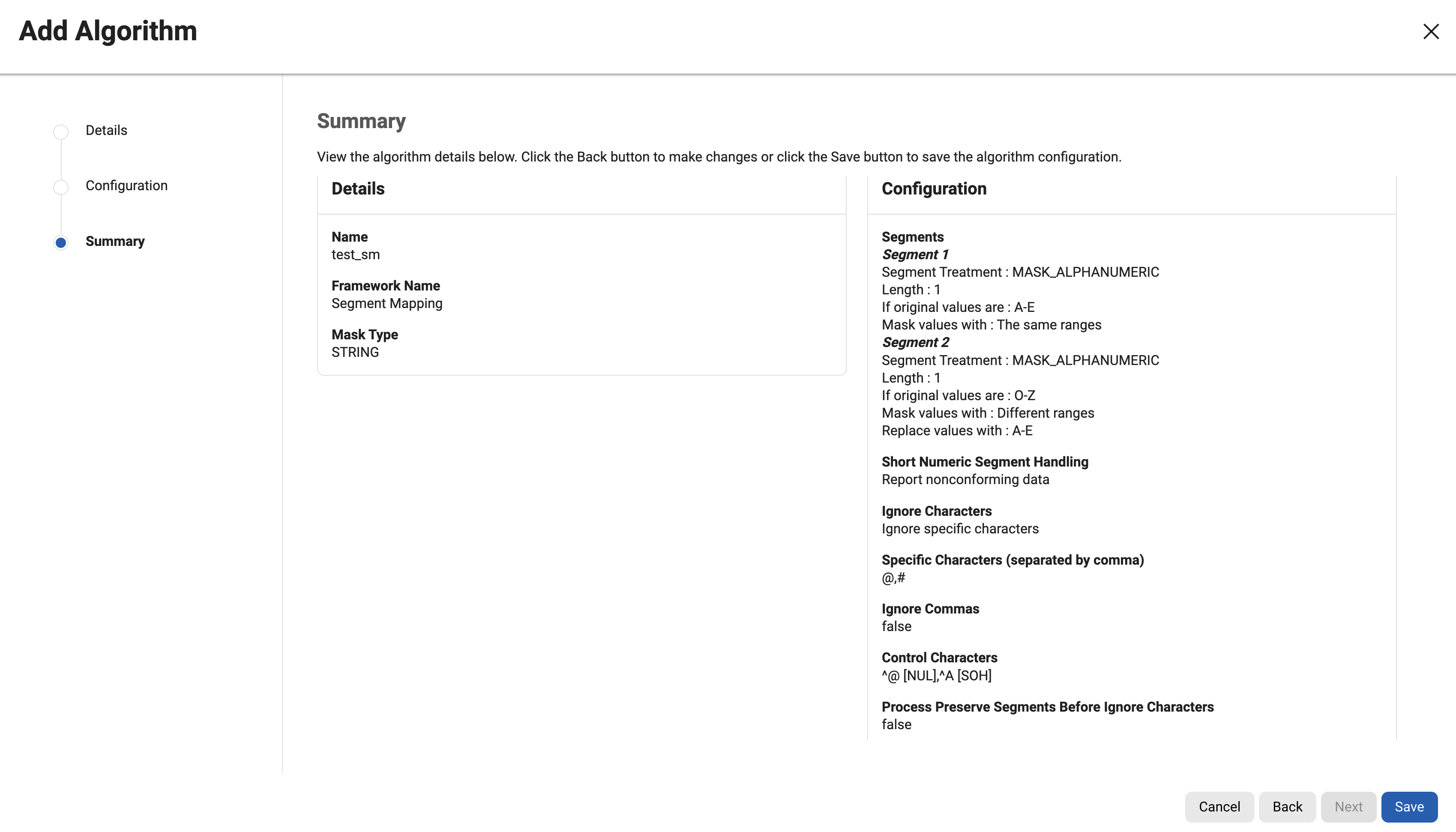 You might use this method if you need columns with unique values, such as Social Security Numbers, primary key columns, or foreign key columns. When using segment mapping algorithms for primary and foreign keys, in order to make sure they match, you must use the same Segment Mapping algorithm for each. You can set the algorithm to produce alphanumeric results (letters and numbers) or only numbers.
