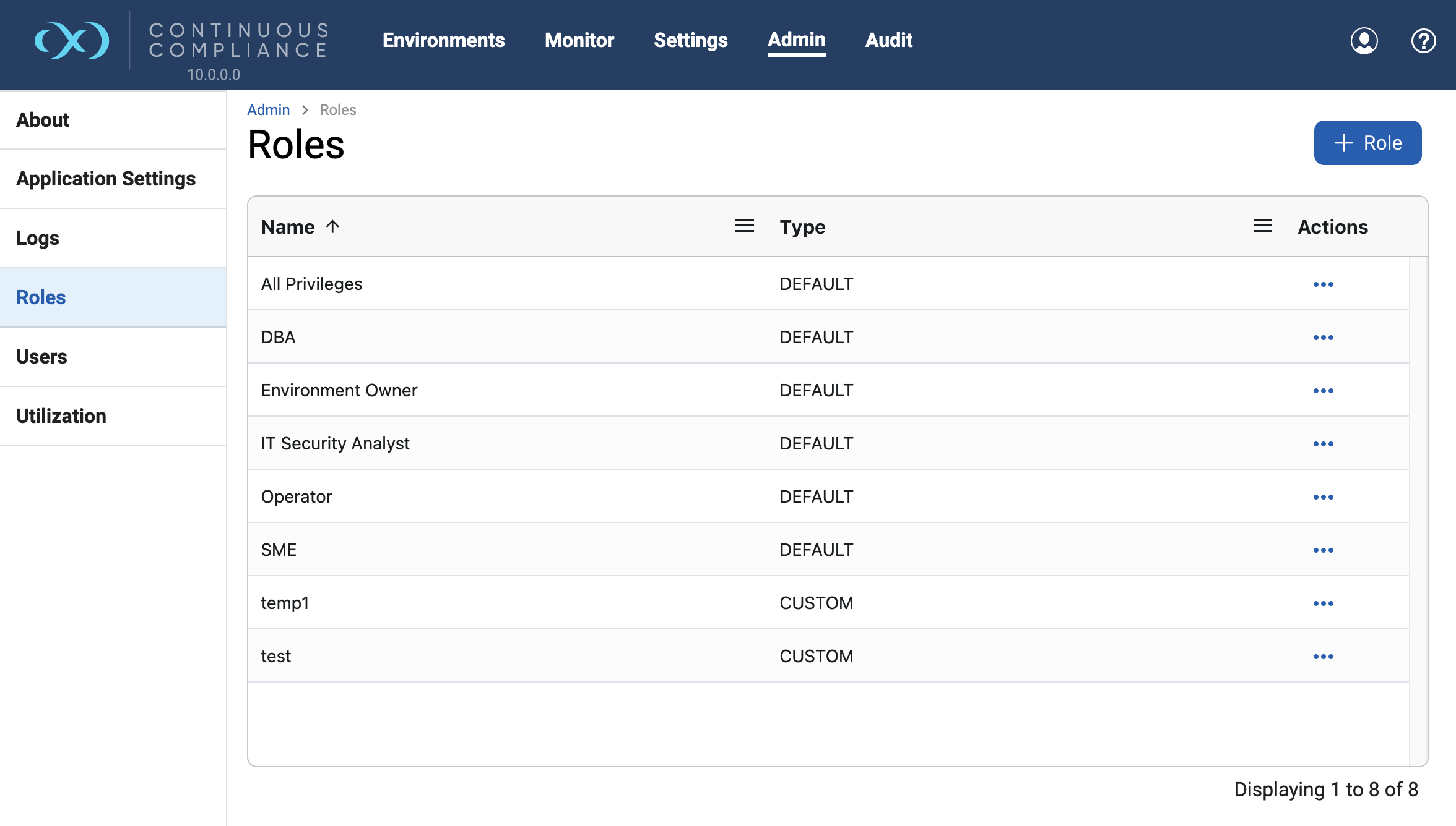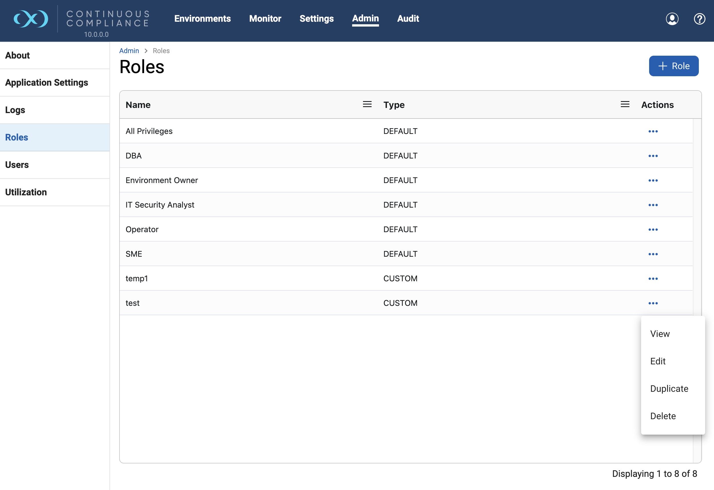 • Roles with CUSTOM type can be added, edited, deleted, duplicated, and viewed.