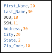 To input the file format for fixed-width files, create a text document with the field names and the length of each field, one combination per line. The screenshot below shows an example of content for fixed-width formats. In this format, the field name is followed by the length of the field, separated by a comma.