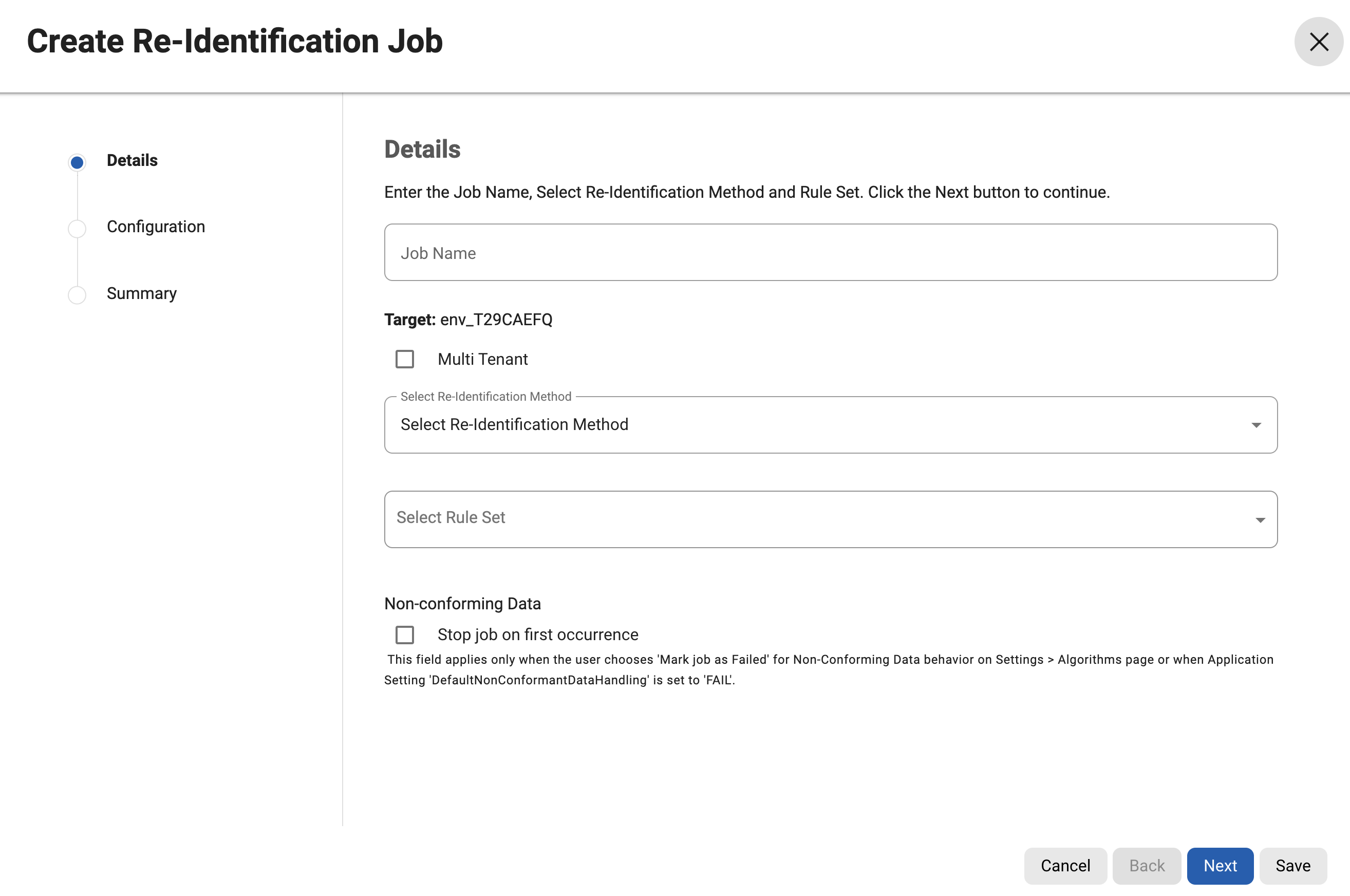 To create a re-identification job, click on the + Re-Identification Job button on the upper side of the page. The flow and fields will be the same as the Masking job.