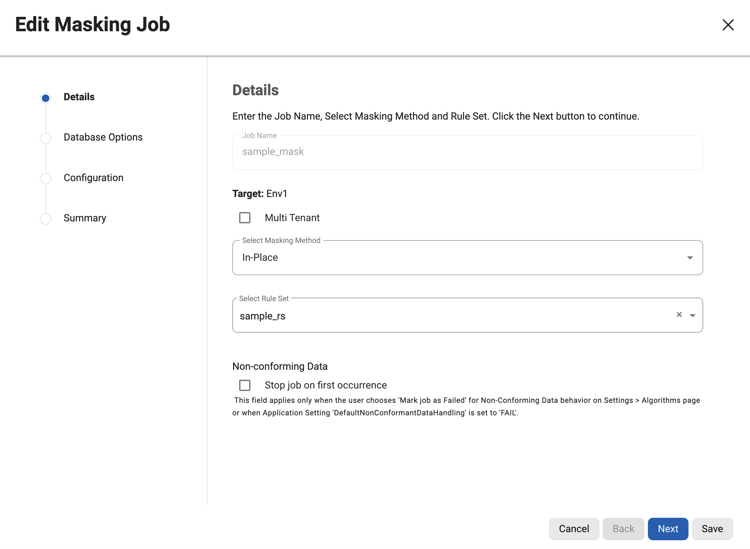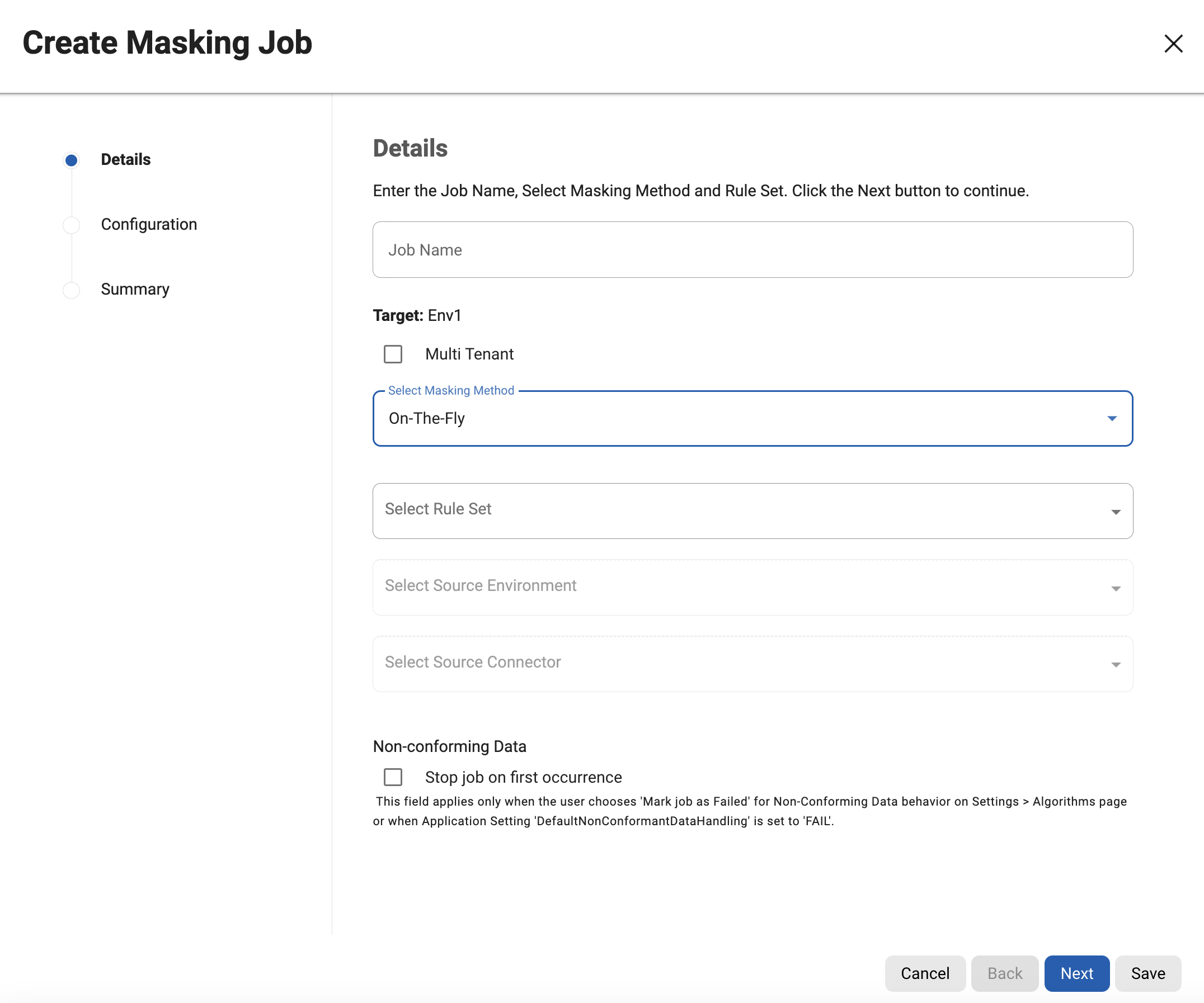 Click the + Masking Job button at the top of the page, then the Create Masking Job window will appear.