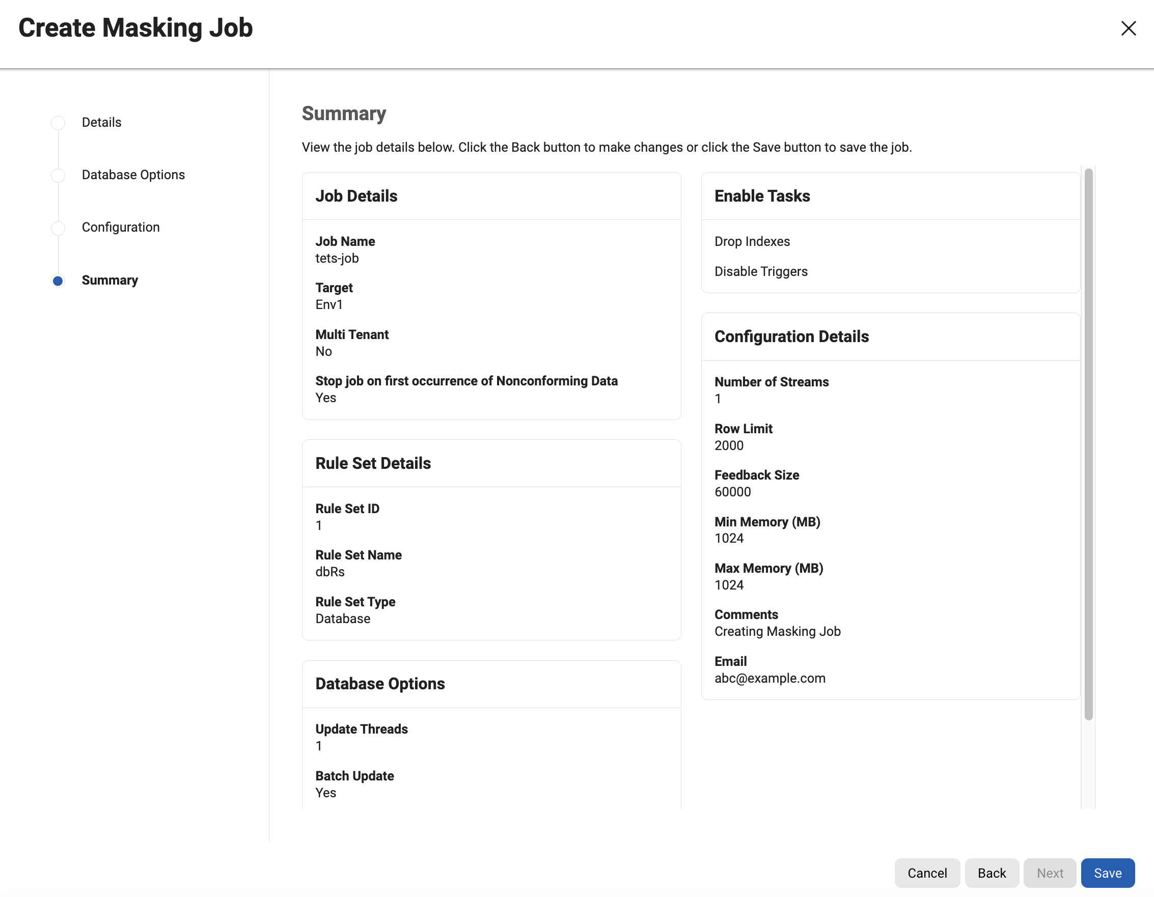 Drop Indexes (optional): Whether to automatically drop indexes on columns that are being masked and automatically re-create the index when the masking job is completed. The default is for this checkbox to not be selected and therefore not perform automatic dropping of indexes.