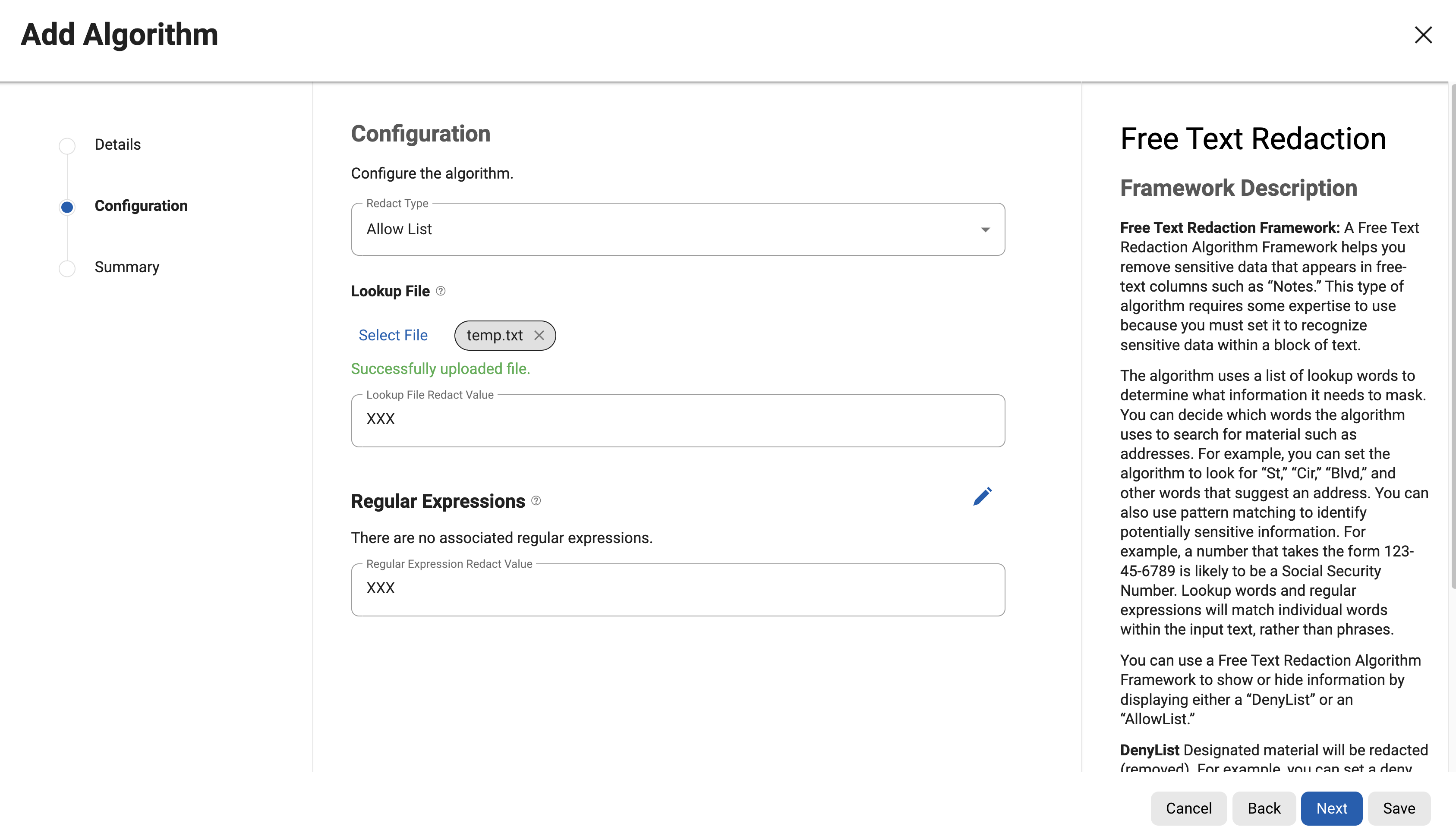 The Free Text Redaction Algorithm Framework is designed to effectively remove sensitive information from unstructured text fields, such as "Notes" columns in databases. Utilizing this framework involves configuring the algorithm to recognize and mask sensitive data embedded within text, which requires some expertise.