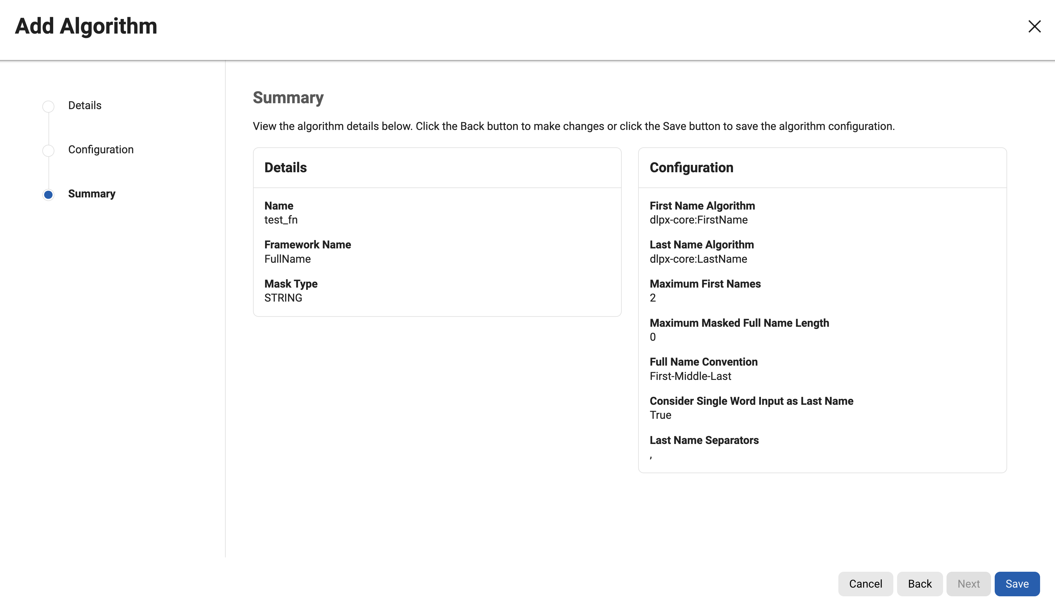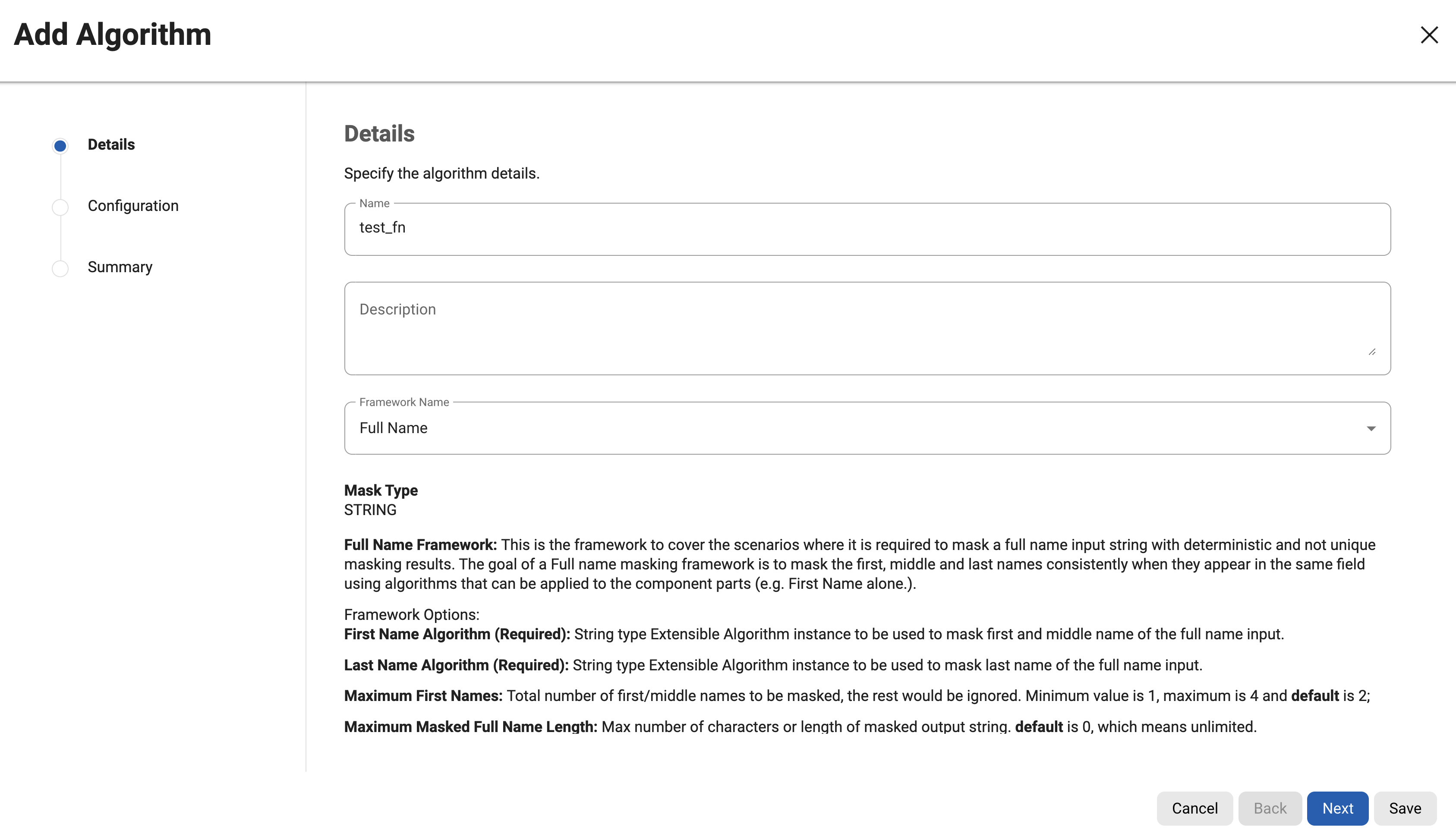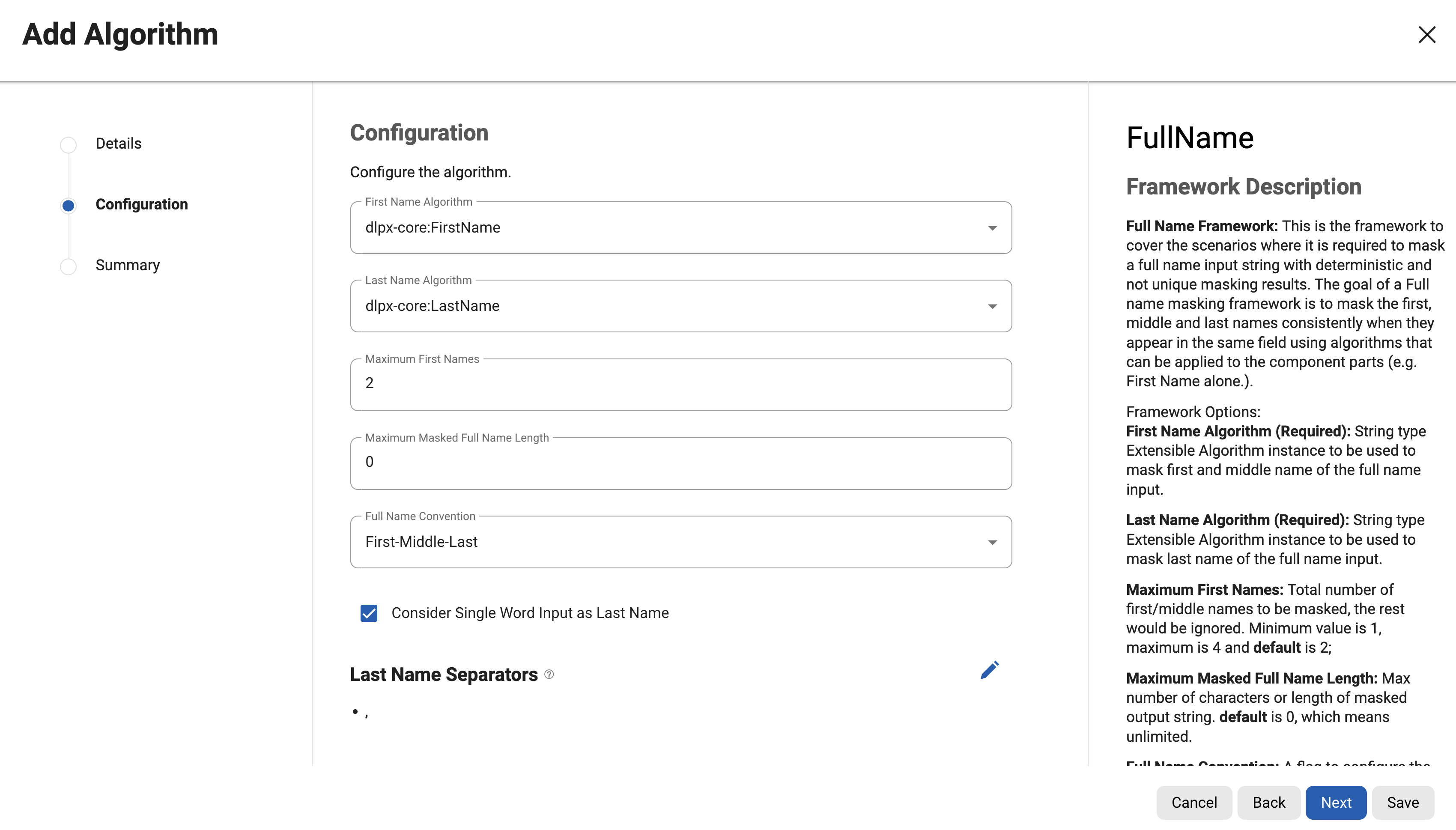 The chained instances for First Name and Last name masking can be any existing extensible algorithm instance that masks the String type. However, it is recommended to use the instances based on the Name framework. Particles can only be considered for Name framework algorithms, and it’s recommended that the First Name and Last Name algorithm instances have the same particle files.