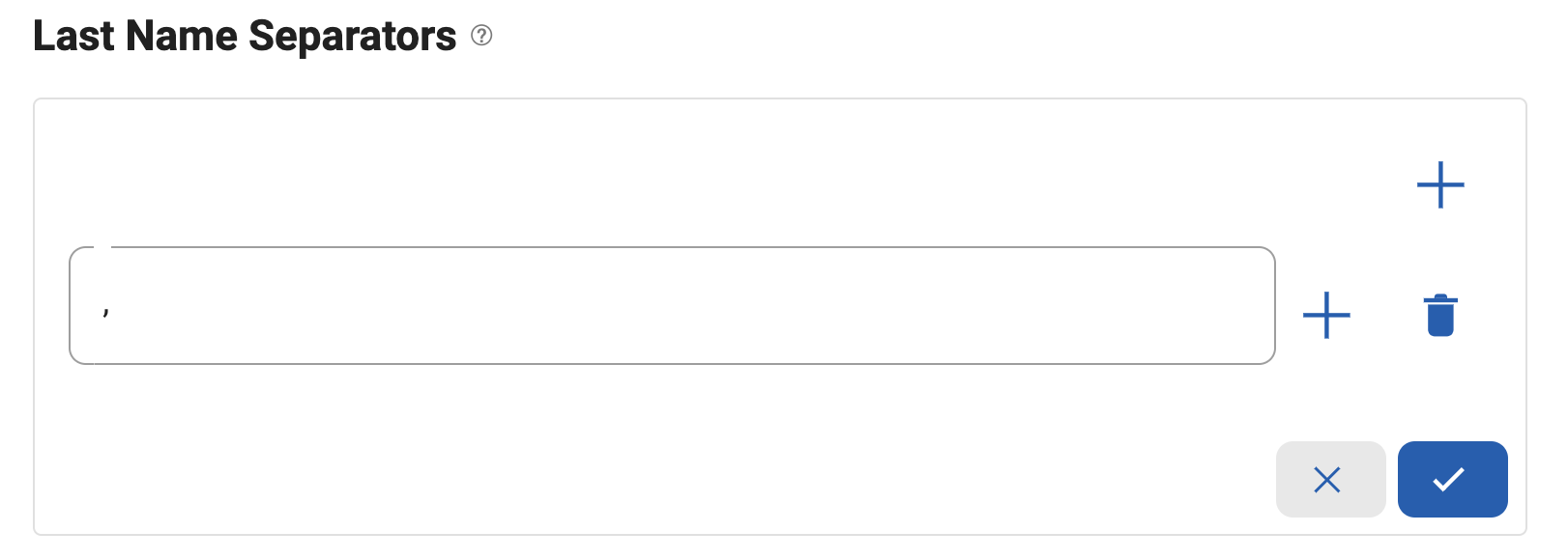 This configuration helps the Full Name algorithm distinguish between first name(s) and last name if the Last Name Separator(s) are not configured or not detected in the input string.