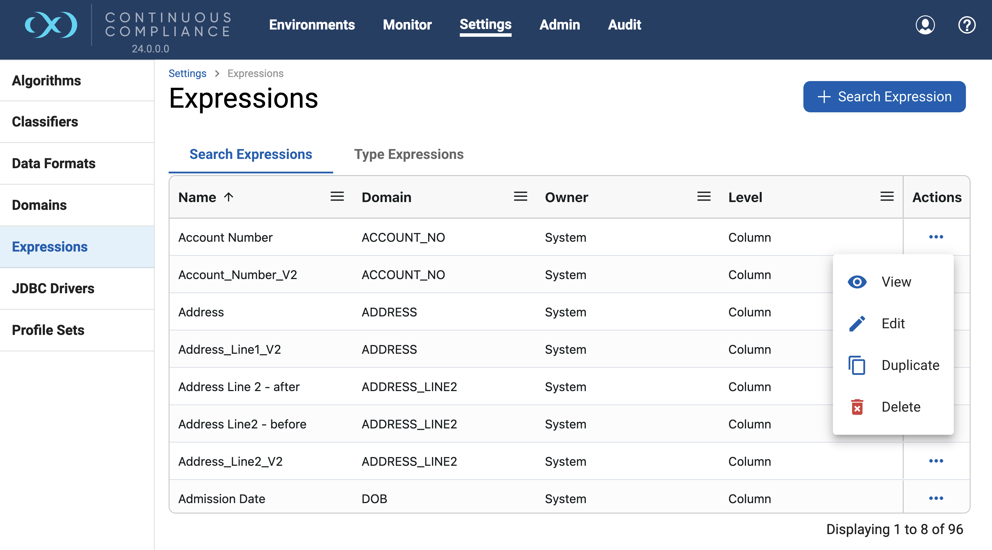 Clicking the Delete Action will prompt for confirmation. Click on Confirm to delete the expression. Deletion will be blocked if the expression is currently assigned to one or more profile sets.