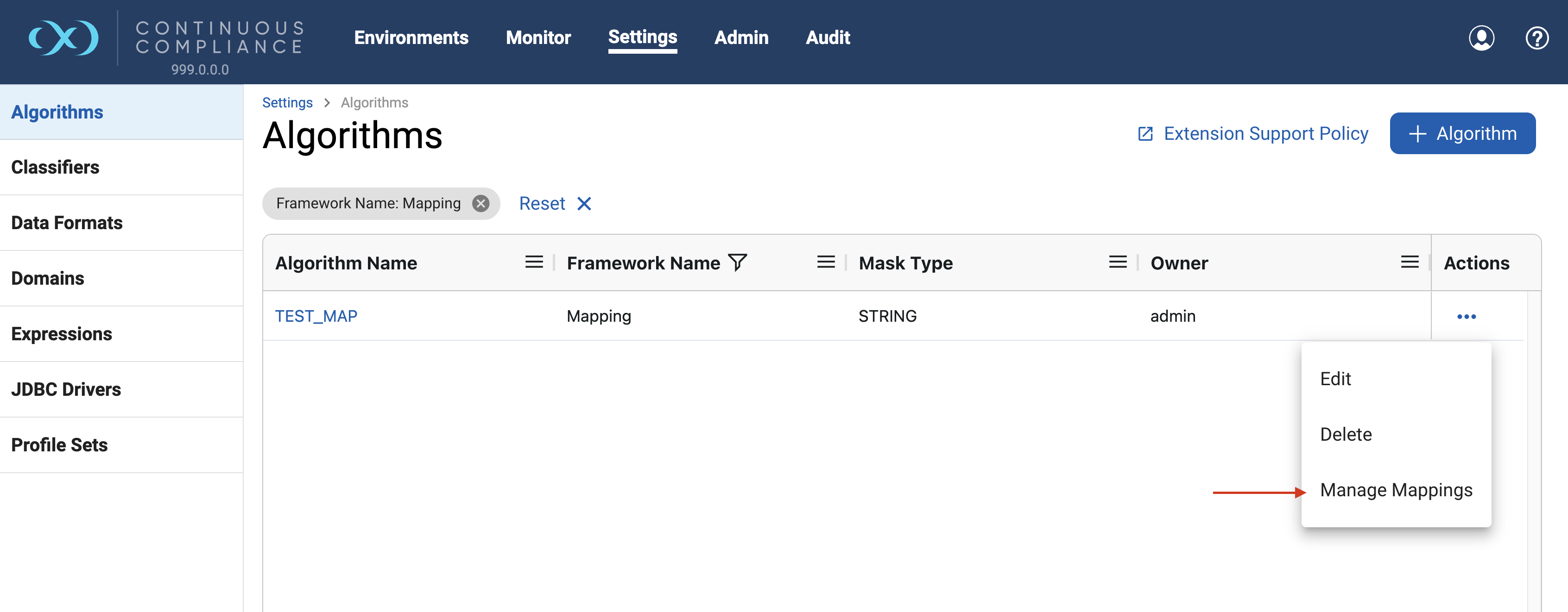 To Manage Mappings, click the (…) button to the right of the corresponding Mapping algorithm row under the Actions column and select the Manage Mappings option.