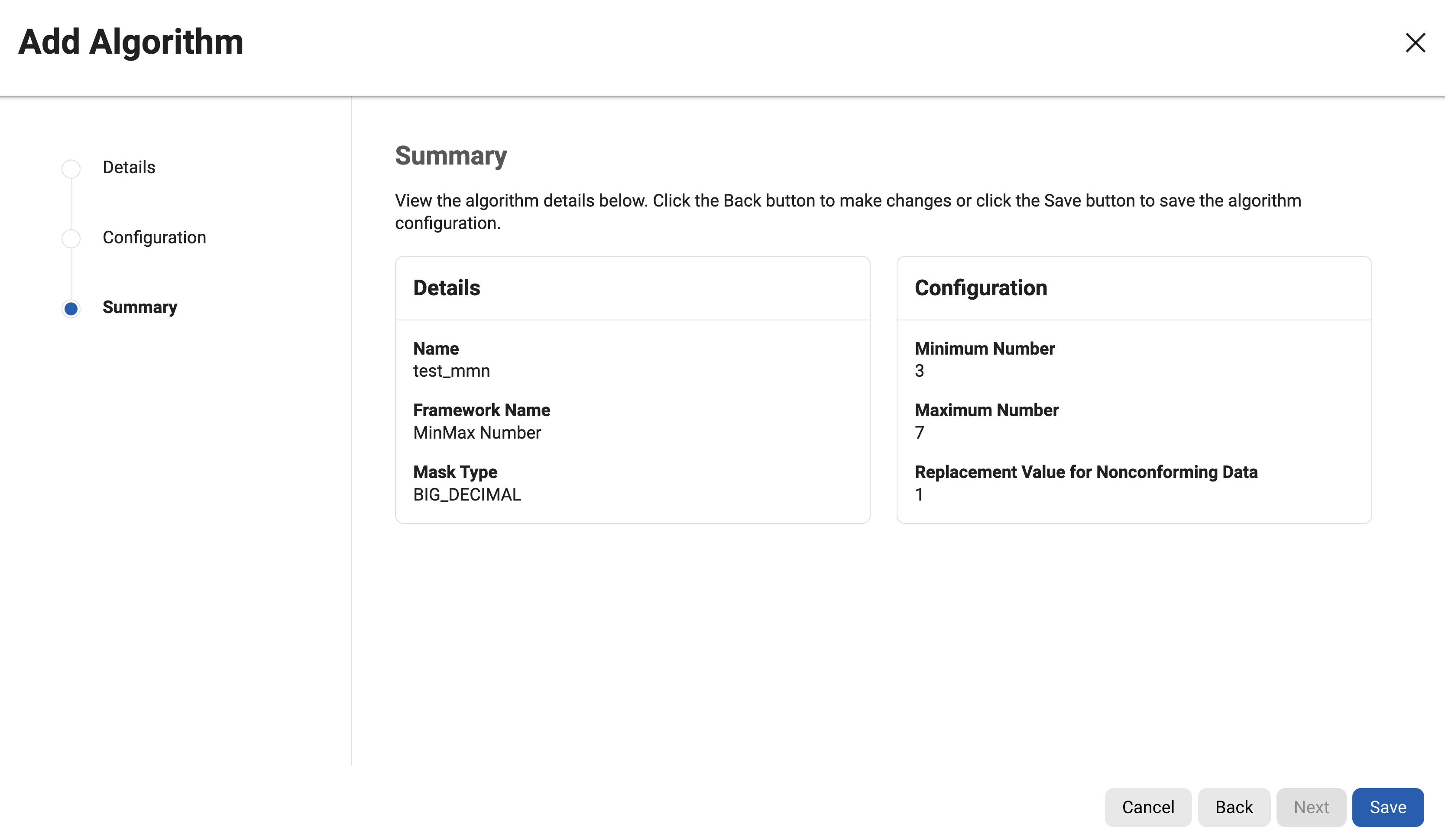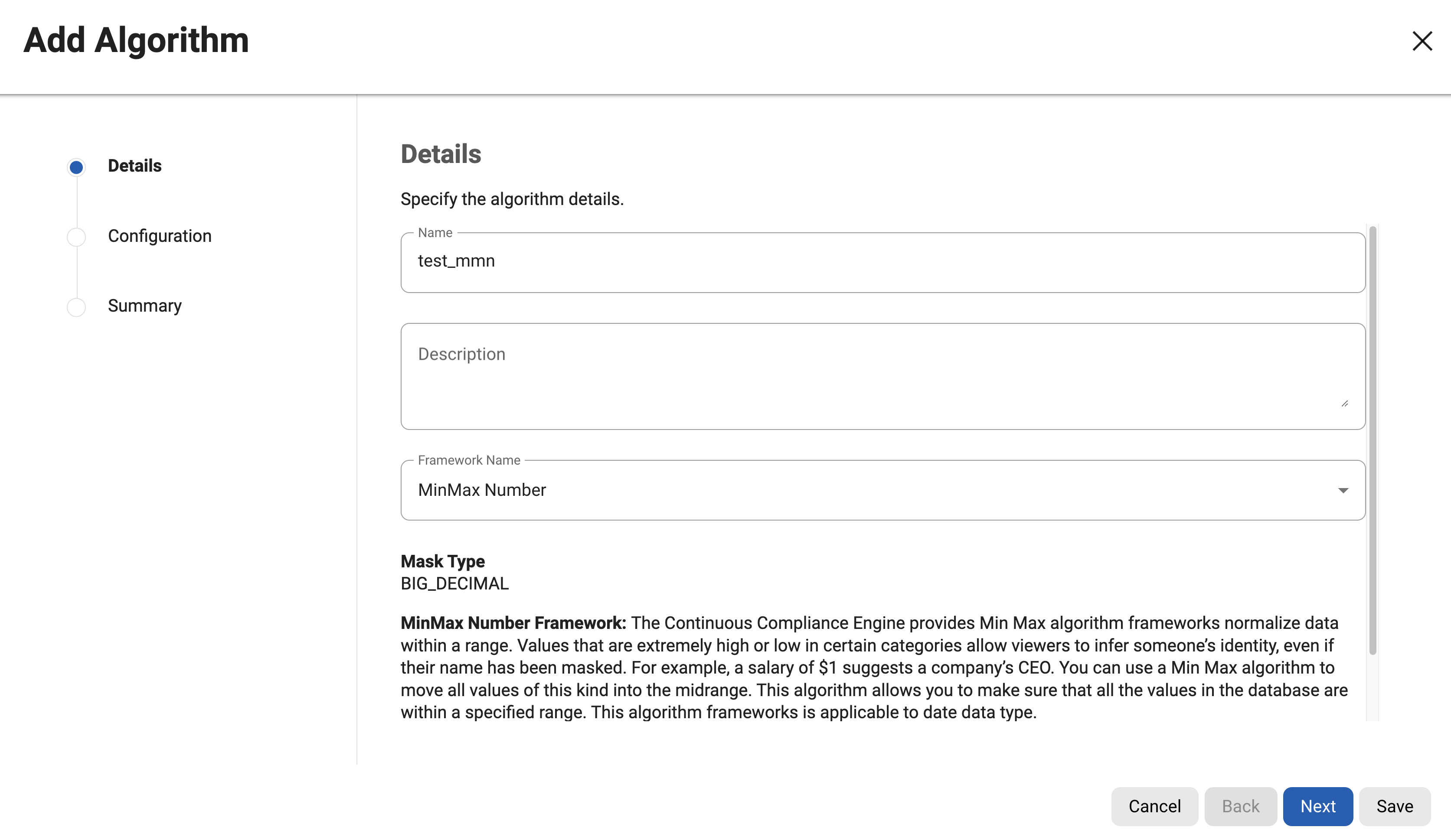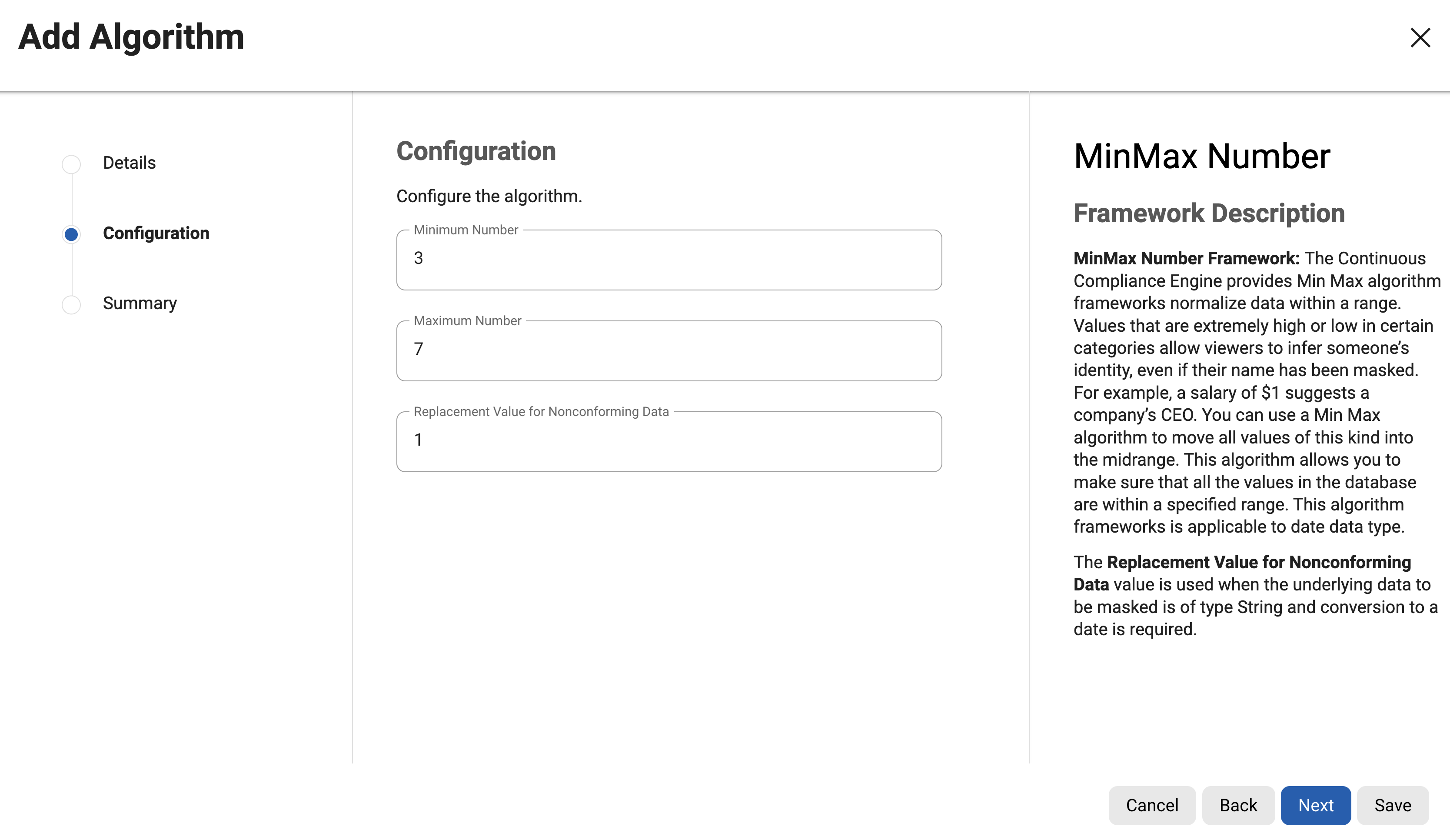 The Continuous Compliance Engine provides a "MinMax Number" to normalize data within a range. Values that are extremely high or low in certain categories allow viewers to infer someone’s identity, even if their name has been masked. For example, a record with the highest salary might be for a company’s CEO. You can use a MinMax Number algorithm to move all values of this kind into the midrange. This algorithm allows you to make sure that all the values in the database are within a specified range. The algorithm framework applies to numeric data types.