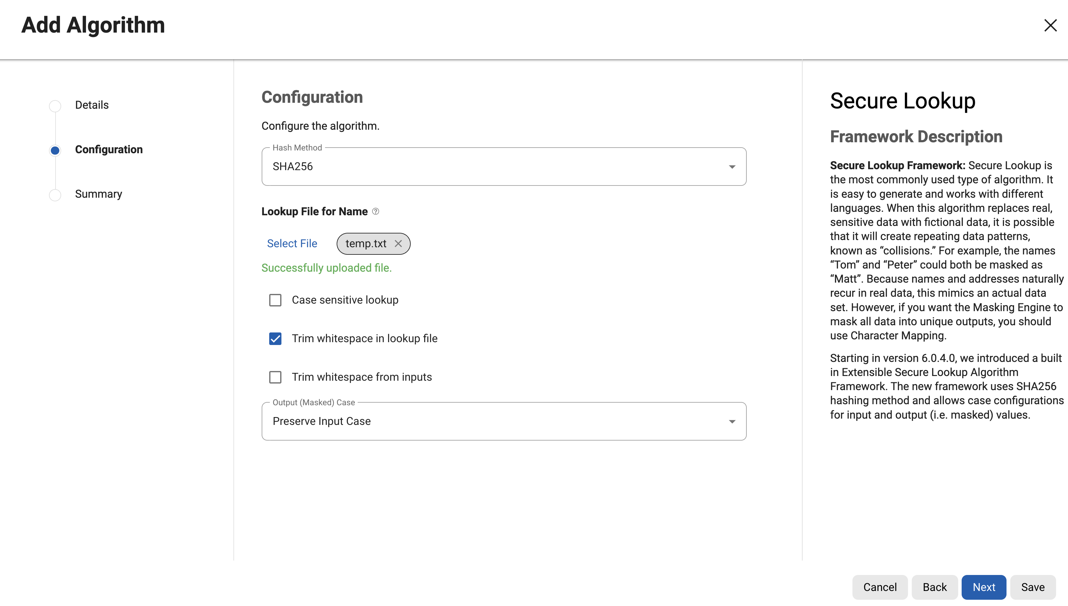 Secure Lookup is the most commonly used type of algorithm. It is easy to generate and works with different languages. When this algorithm replaces real, sensitive data with fictional data, it is possible that it will create repeating data patterns, known as “collisions.” For example, the names “Tom” and “Peter” could both be masked as “Matt”. Because names and addresses naturally recur in real data, this mimics an actual data set. However, if you want the Masking Engine to mask all data into unique outputs, you should use Character Mapping.