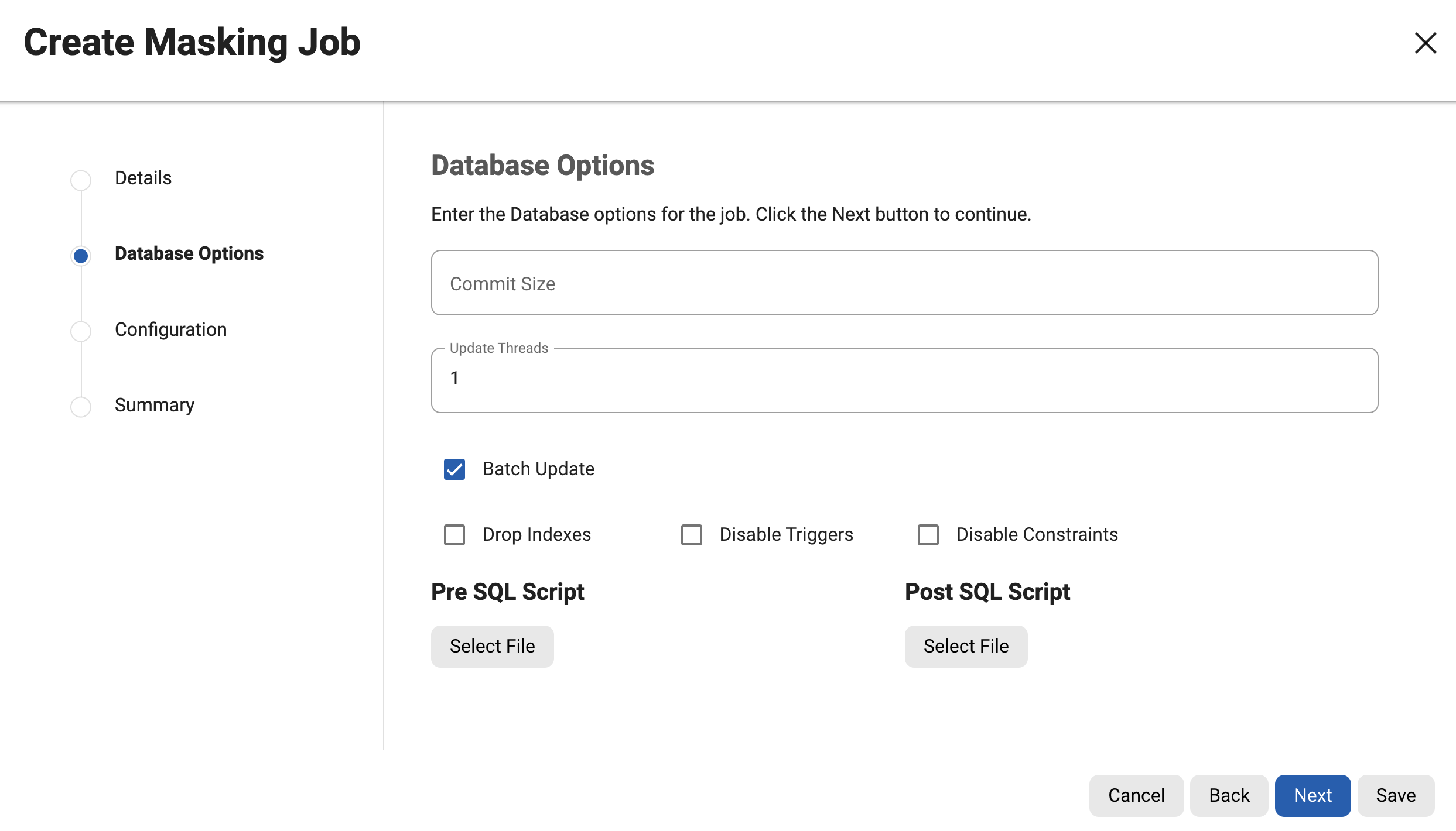 Batch Update (optional): Enable or disable whether the database load phase to output the masked data will be performed in batches or not. The size of the batches is determined by the Commit Size field value. This option is recommended because it typically improves the performance of the masking job.