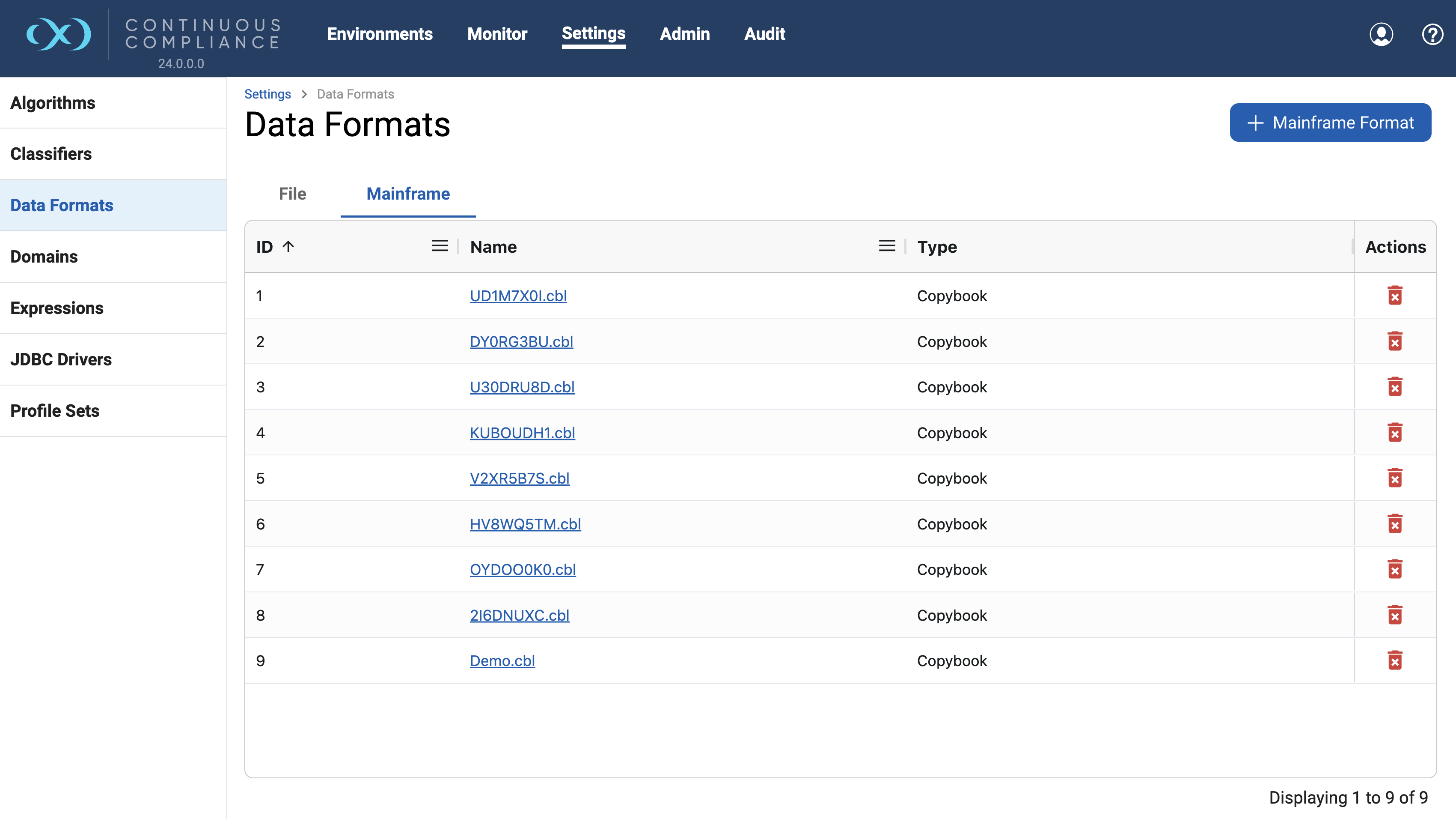 For Mainframe data sets, you can import the file format via the + Mainframe Format button, located in the Mainframe tab. This will import the copybook directly into the Continuous Compliance Engine.