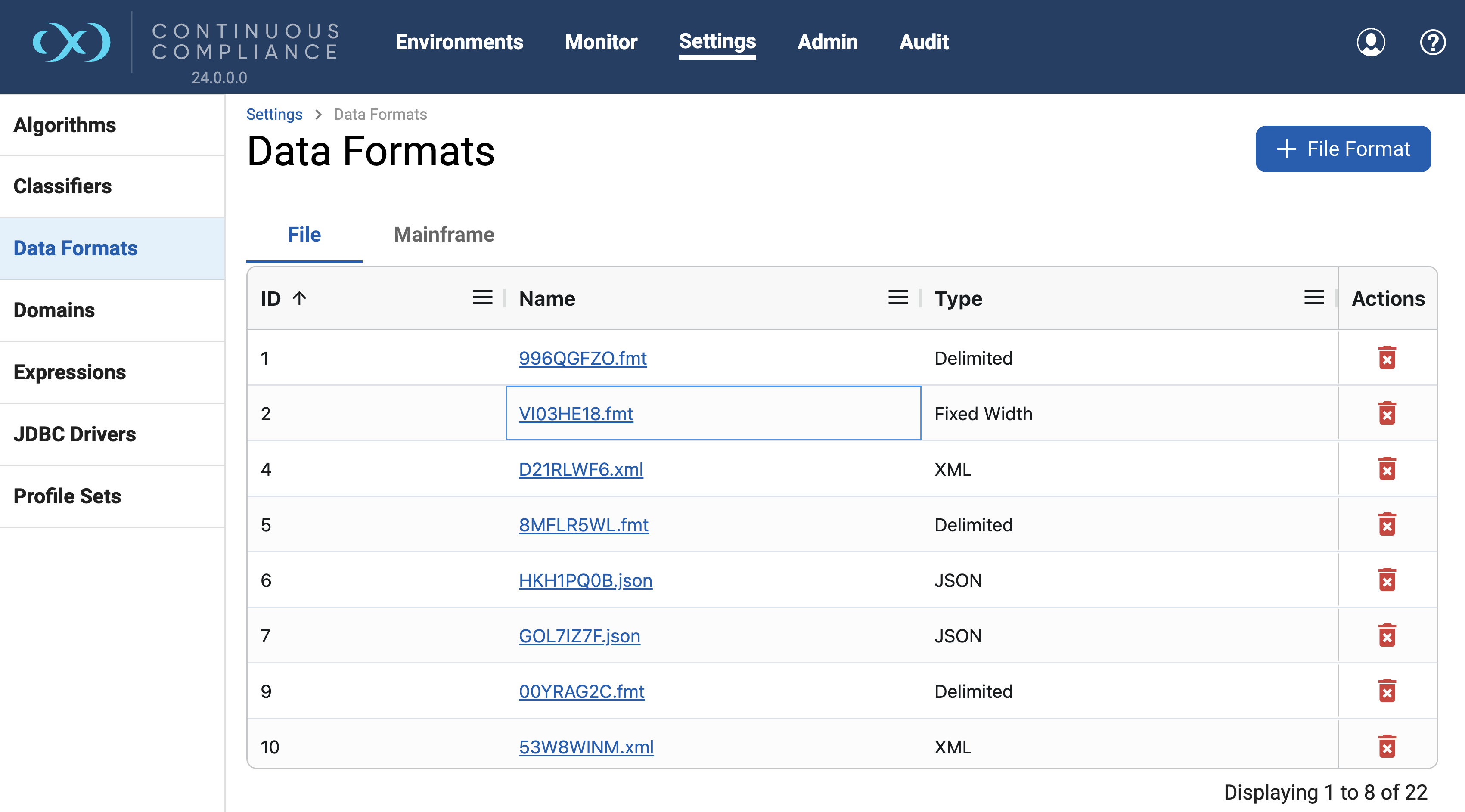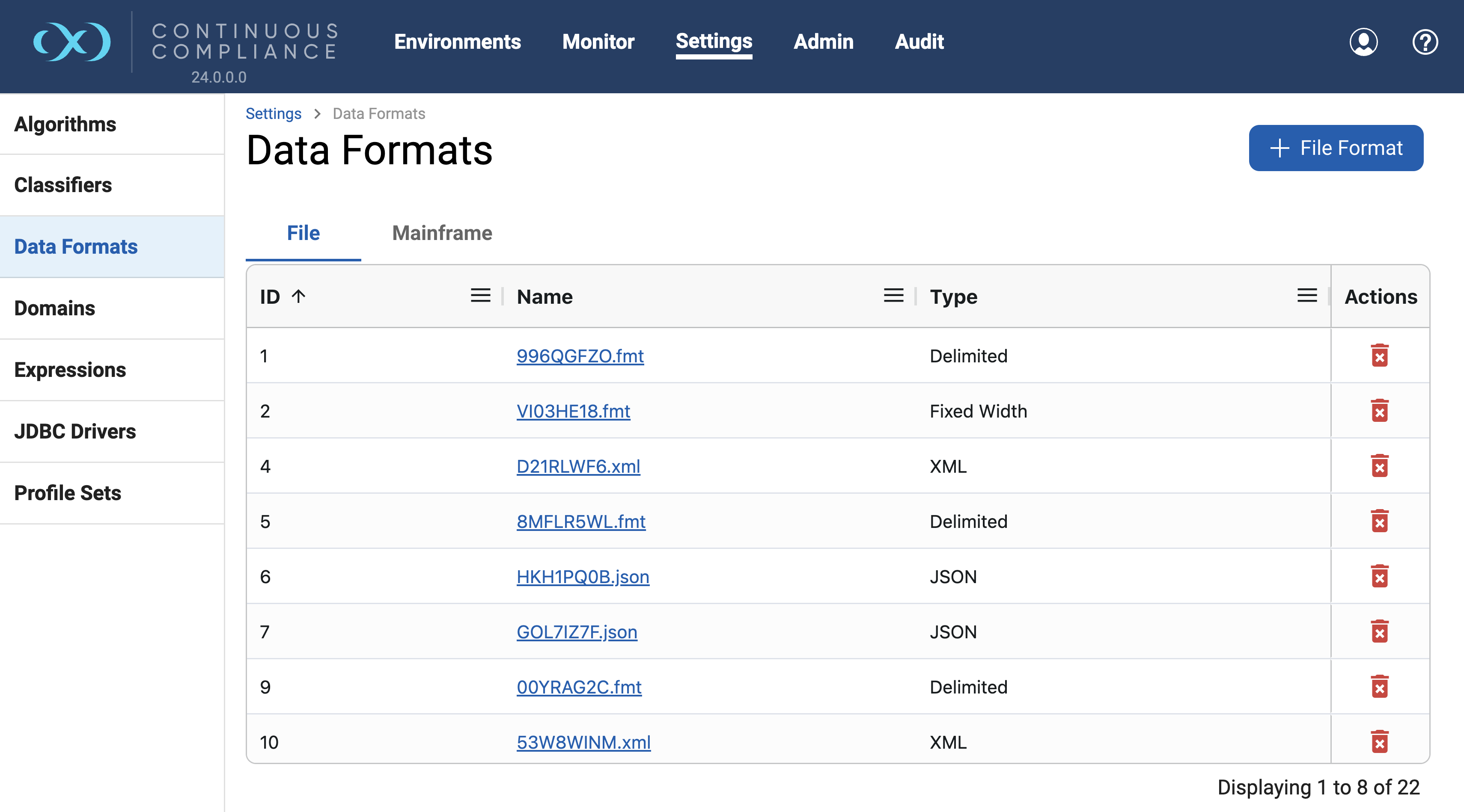 For all file types other than Mainframe, you can import the file format via the + File Format button, located in the Files tab. This will import the file directly into the Continuous Compliance Engine.
