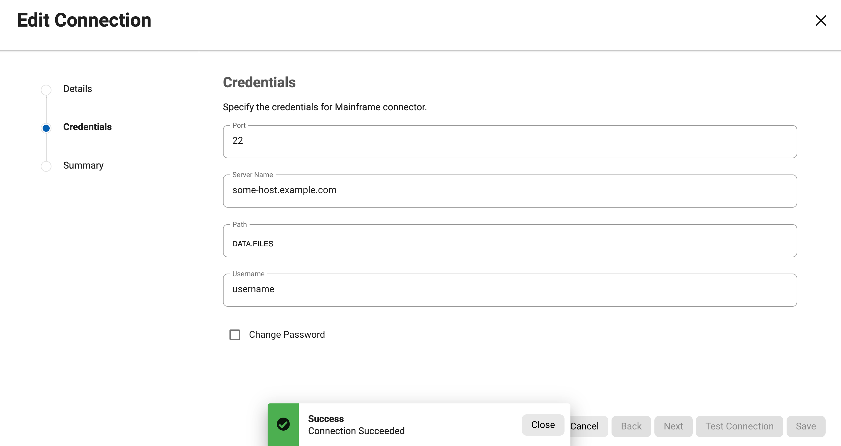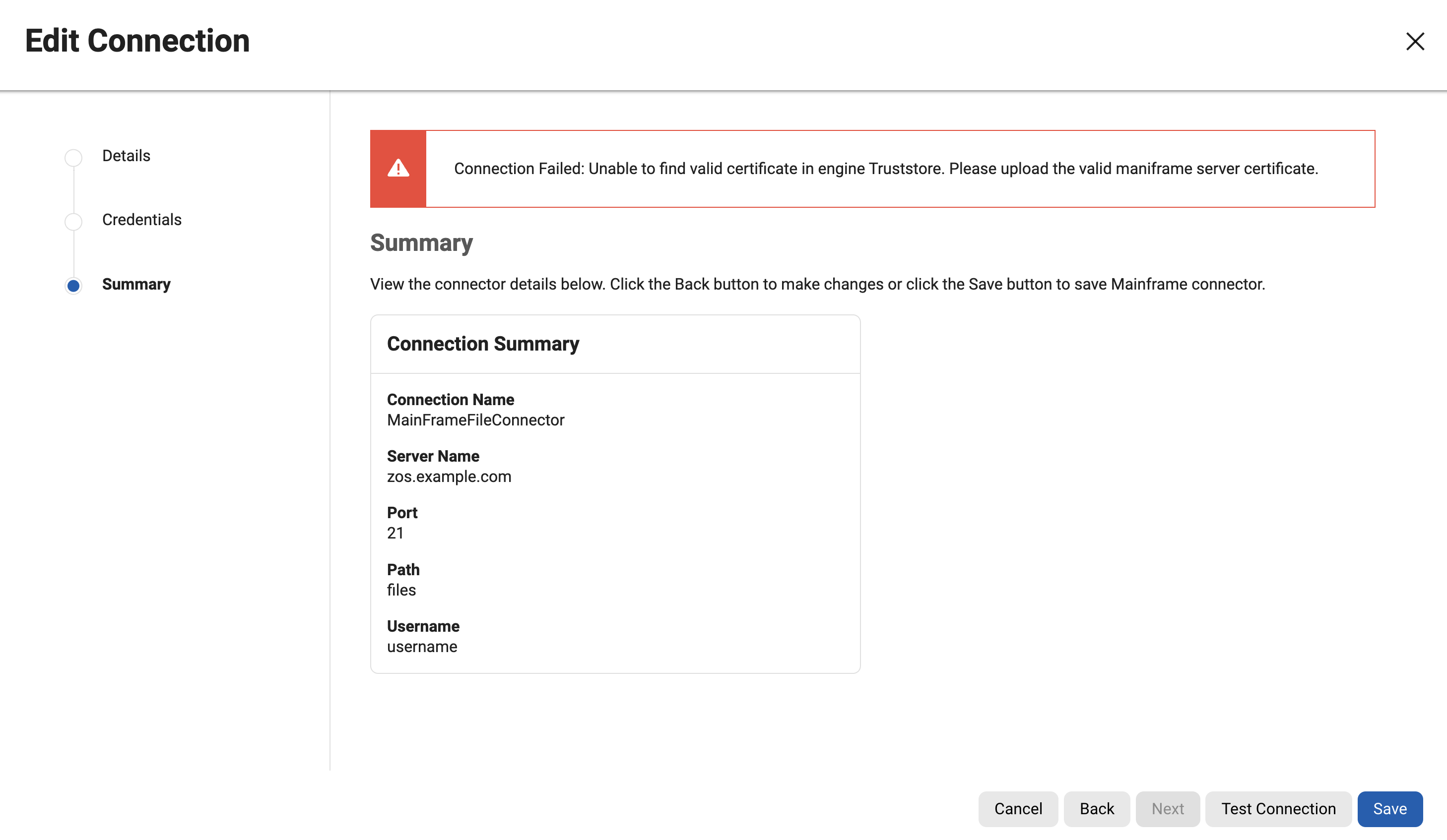 To establish a successful connection to the mainframe using FTPS, it is important that users upload the Server SSL Certificate to the TrustStore of the Data Engine. Detailed instructions for adding the certificate to the Data Engine TrustStore can be found in the TrustStore settings page.