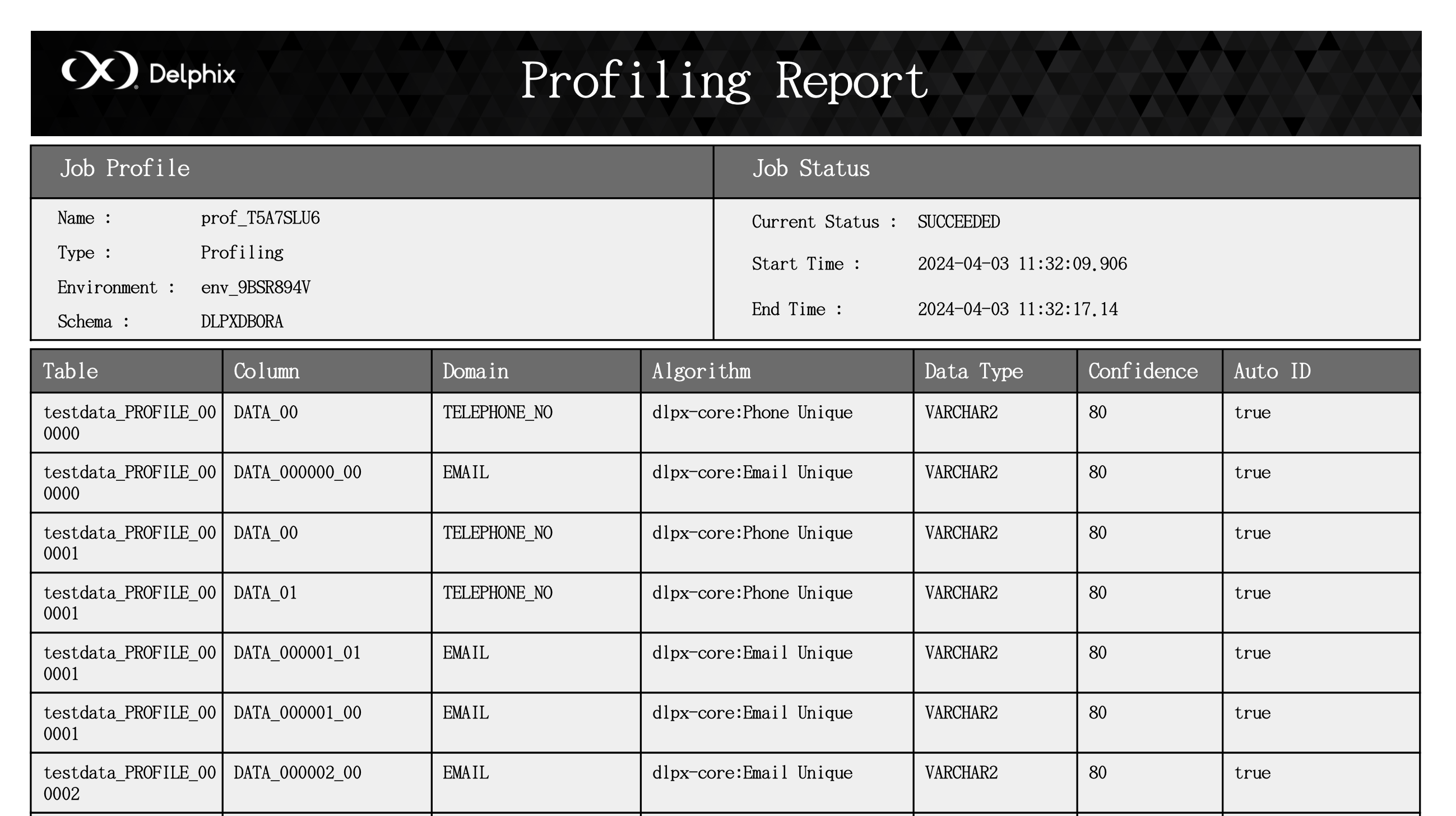 After a Job has been started from the Environment > Jobs screen, clicking on the Job Name will result in the display of the profiling job details. After the Job has been completed, it will display the sensitive data findings on a table-column by table-column or file-field by file-field basis under Profile Results.