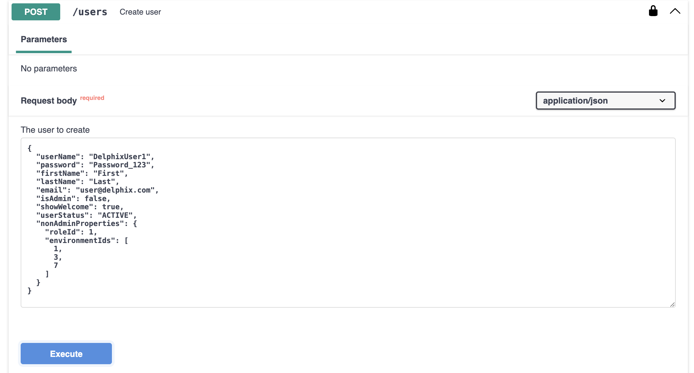 Click Create users using the POST /users section and refer to the Example Value for parameters required for new users.