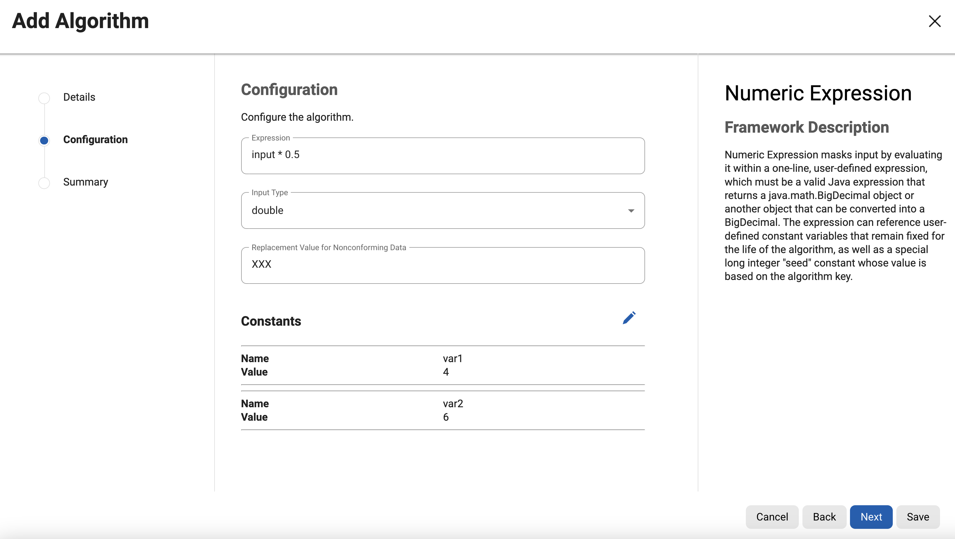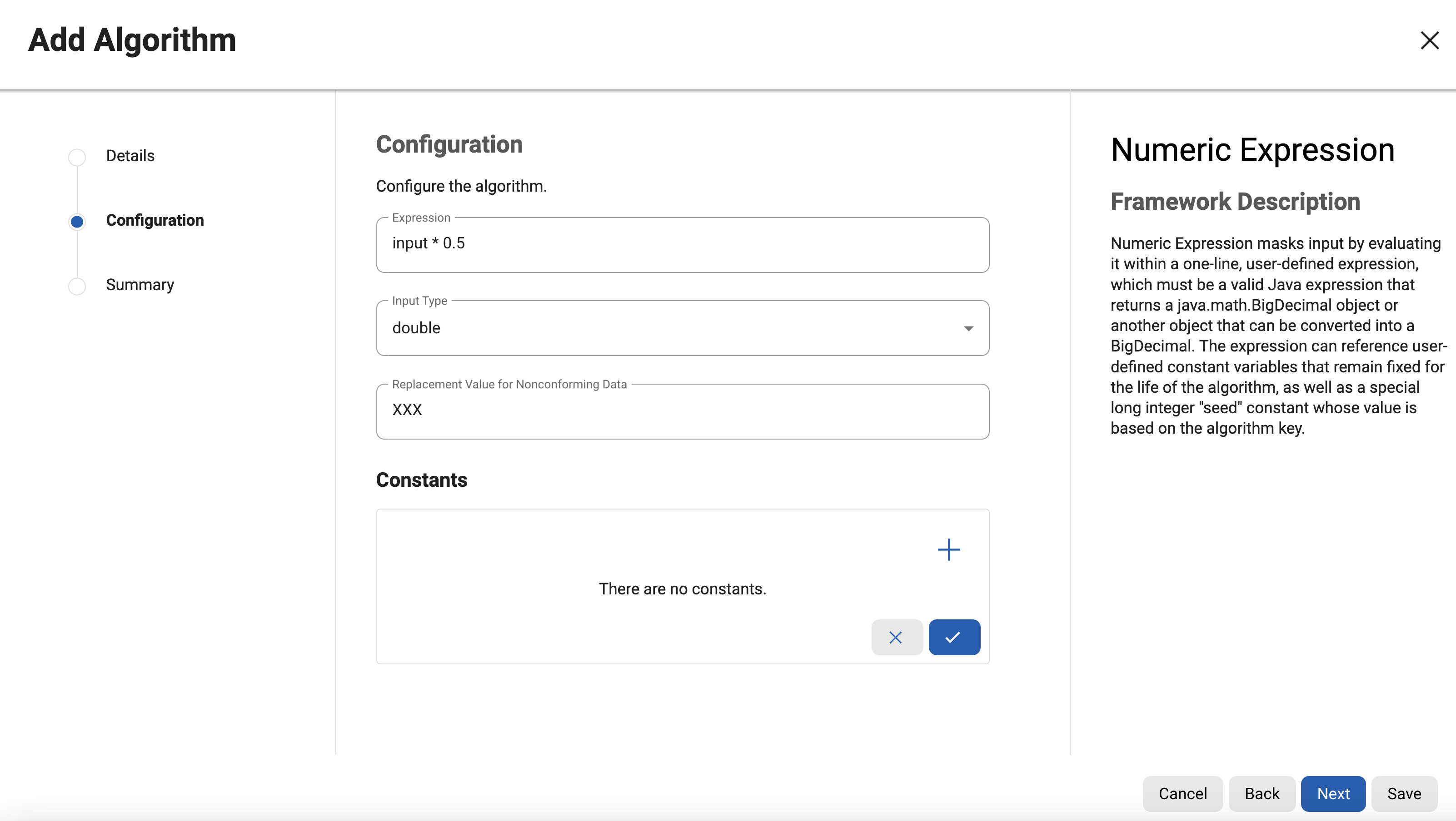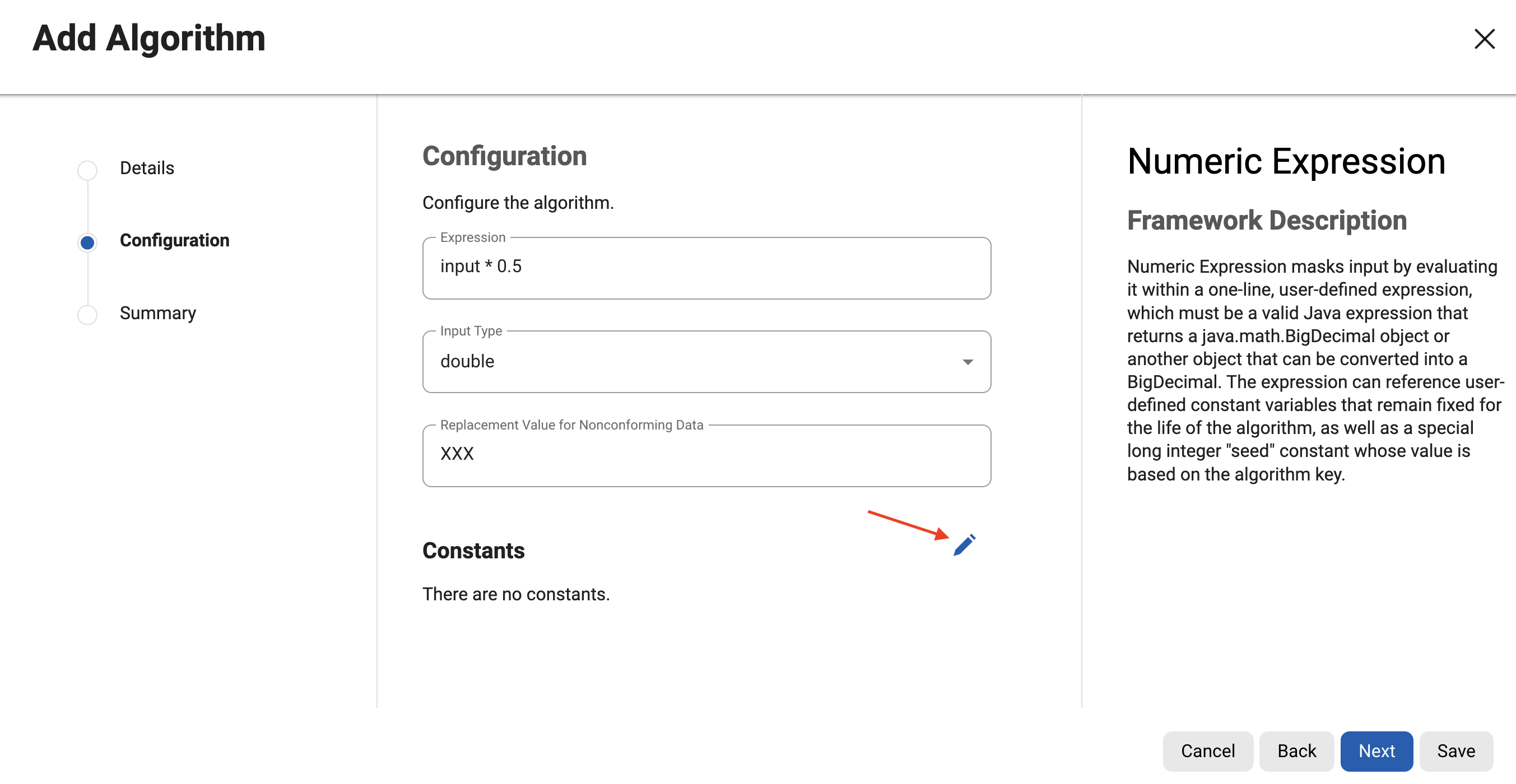 This section gives detailed information about how to use the List editor on the Engine UI. UI for Add and Edit algorithms uses this for updating details. We’ve taken an example of how to add constants for the Numeric expression algorithm using List Editor.