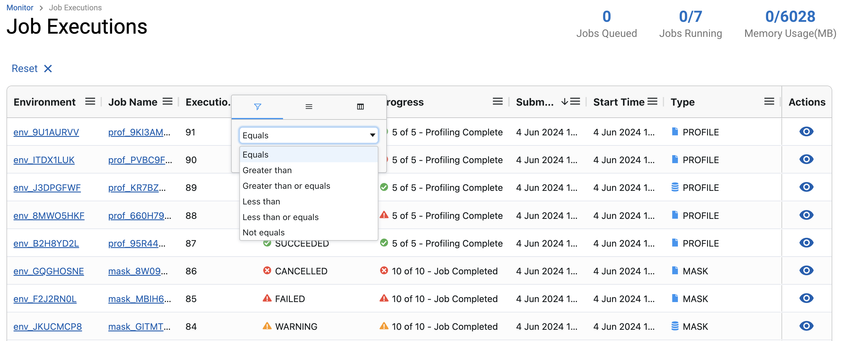 Number filter with options [ “Equals”, “Greater than”, “Greater than or equals”, “Less than”, “Less than or equals”, “Not Equals” ]