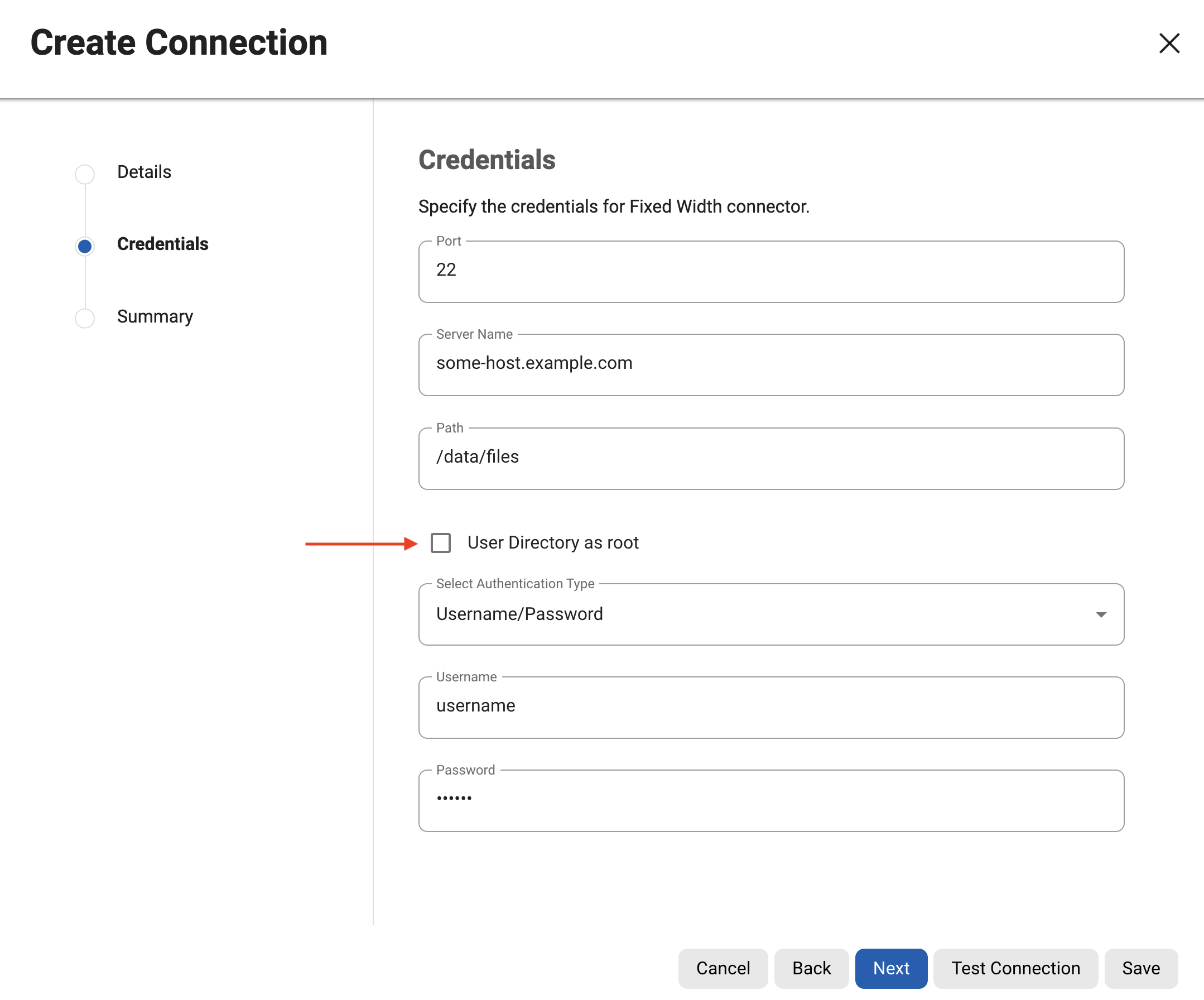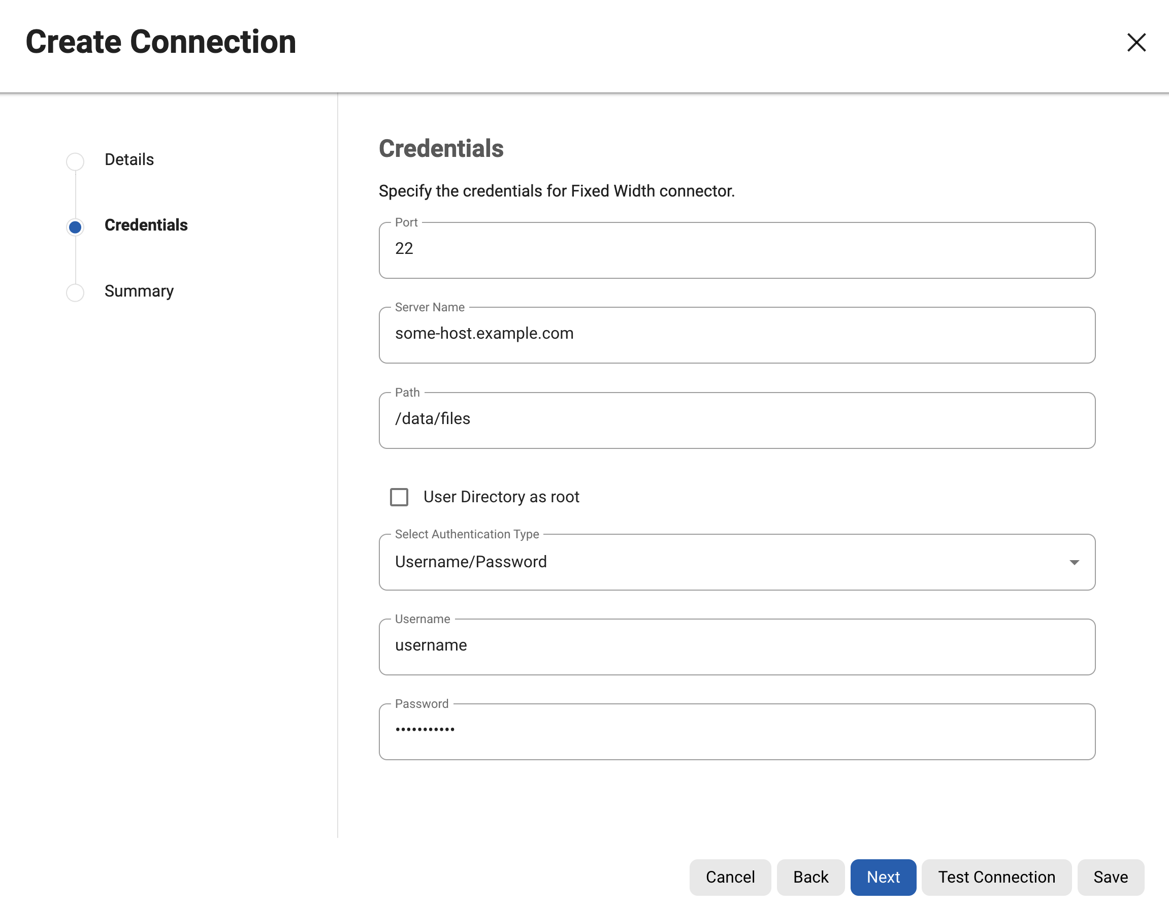For SFTP, FTP & FTPS connection modes, the following values appear under the credential step: