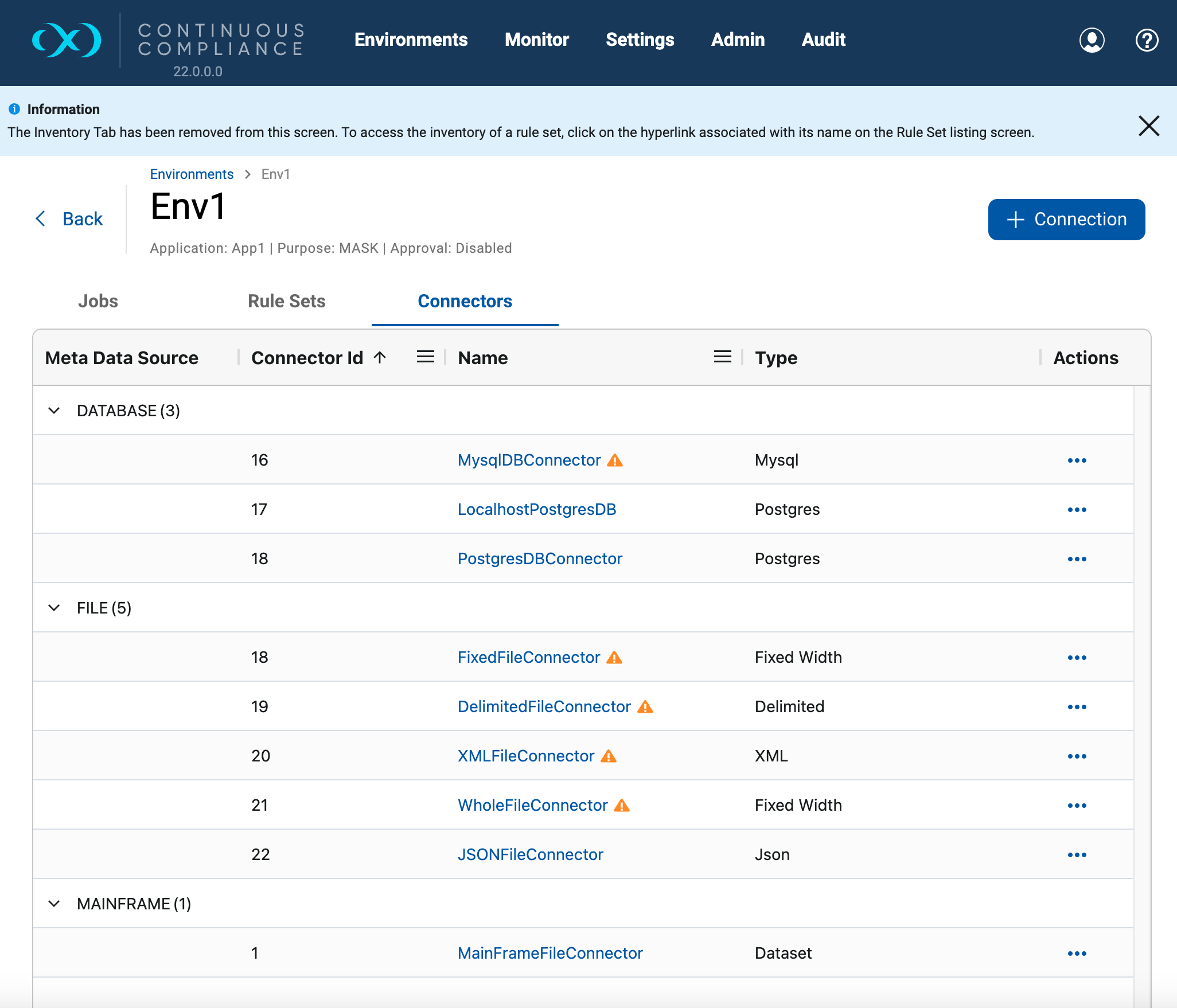 Connectors are used to define data sources that the Continuous Compliance Engine can connect to and are grouped within environments. To navigate to the connectors screen, click on an environment and then click the Connectors tab.